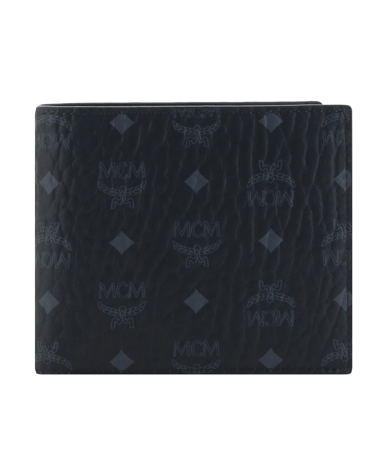 Aren fold wallet by mcm, iconic all-over printed brand monogram, billfold design, interior card slot, bill compartment, coin compartment with snap button closure.