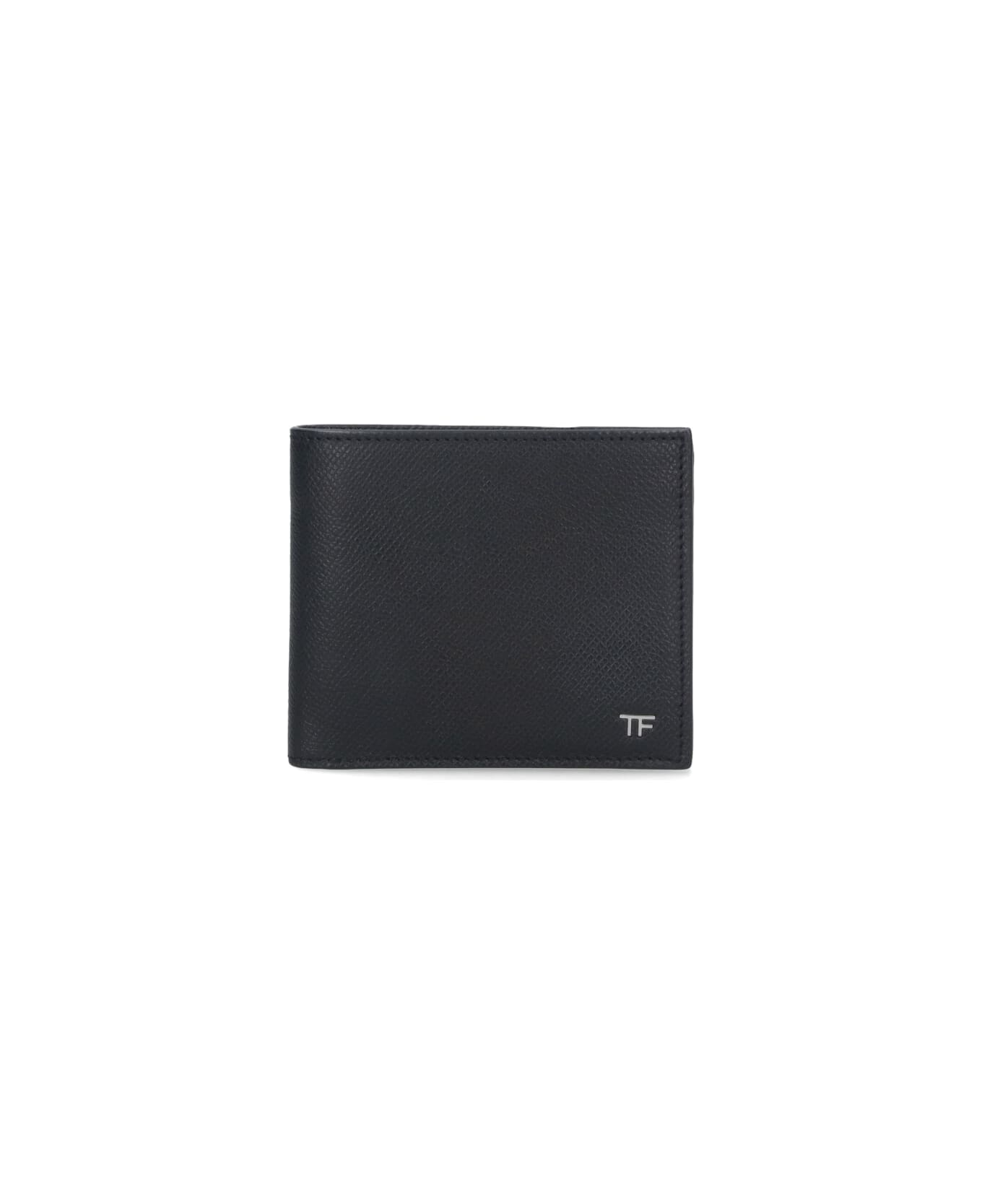 Tom Ford bi-fold logo wallet in black hammered calf leather with silver metal 'TF' logo on the front, eight inner card slots, two inner flat pockets, and an inner bill compartment.
