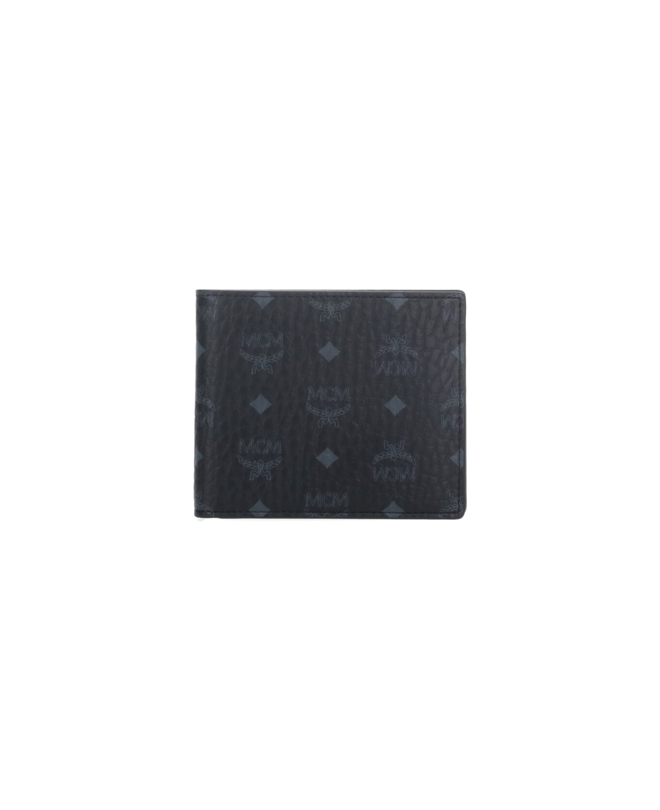 Bi-fold logo wallet MCM, in black "Visetos" with nappa trim, logo print pattern, six inner card slots, two inner flat pockets, an inner bill compartment.