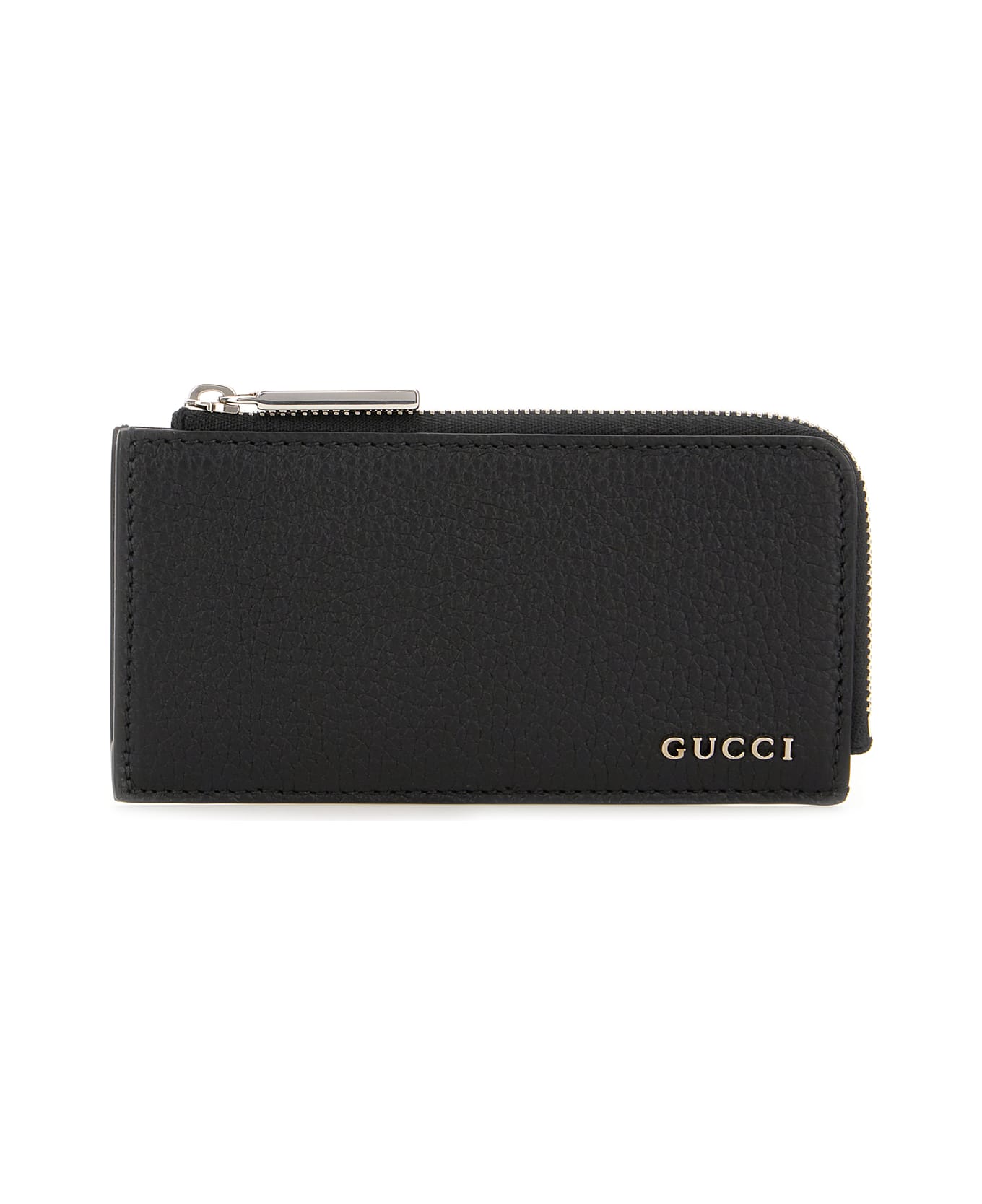 Card holder realized in grained calf leather enriched by metal lettering logo at the front. -Zip closure -Five credit card slots Composition: Exterior: 100% Calf Finishing: Silver metal