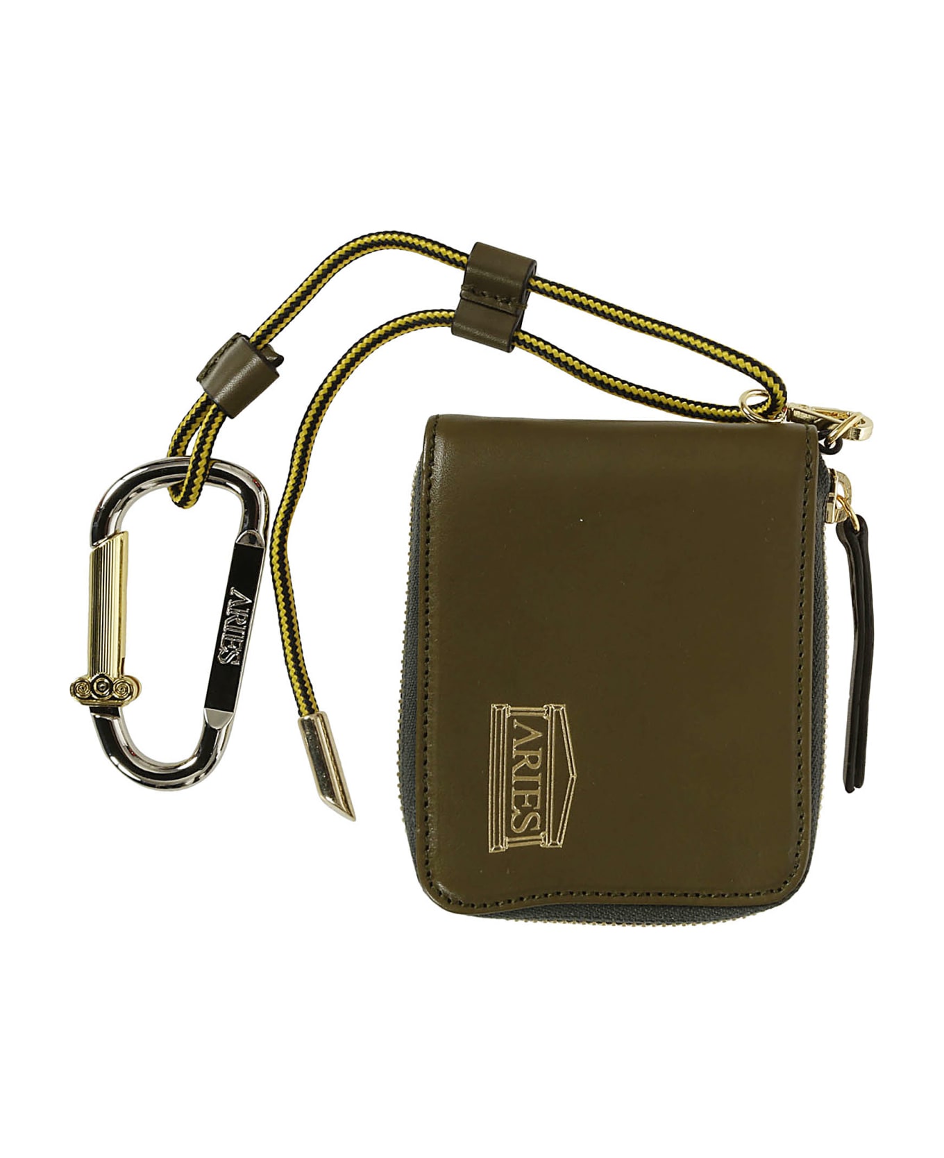 Aries Green leather wallet, zip closure, logo detail, lace with carabiner.