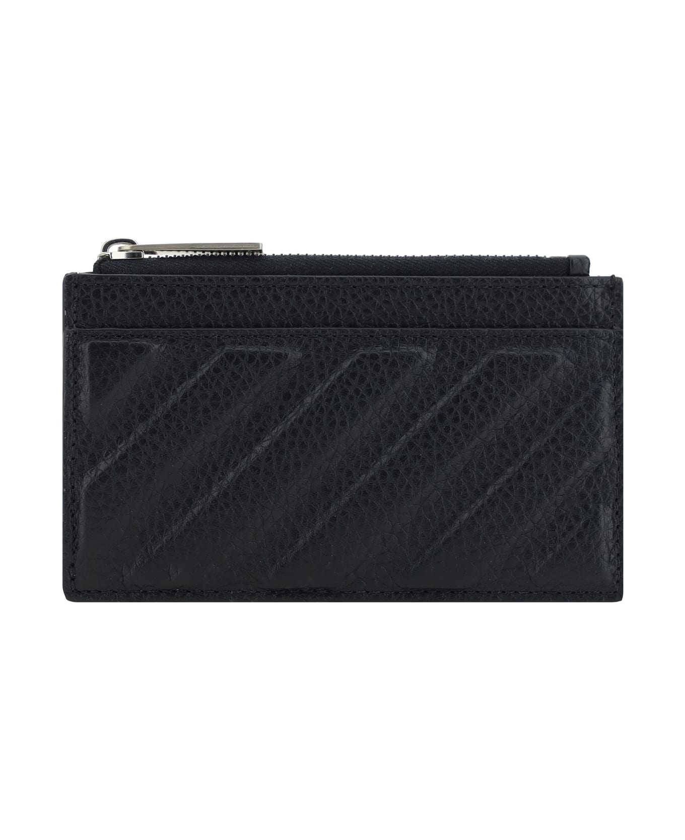 Calfskin card holder by off-white, top zipper closure, grained leather design, card slots at back, iconic brand monogram press-stamped on back, oblique embossed bands applied to front.