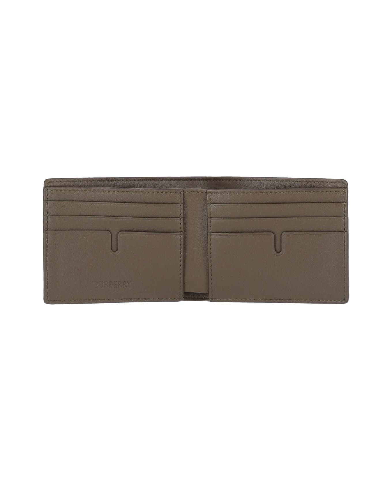 Burberry 'Check' bifold wallet in beige fabric with brown hammered leather details, iconic all-over logo pattern, inner bill compartment, six inner card slots, two inner slip pockets.