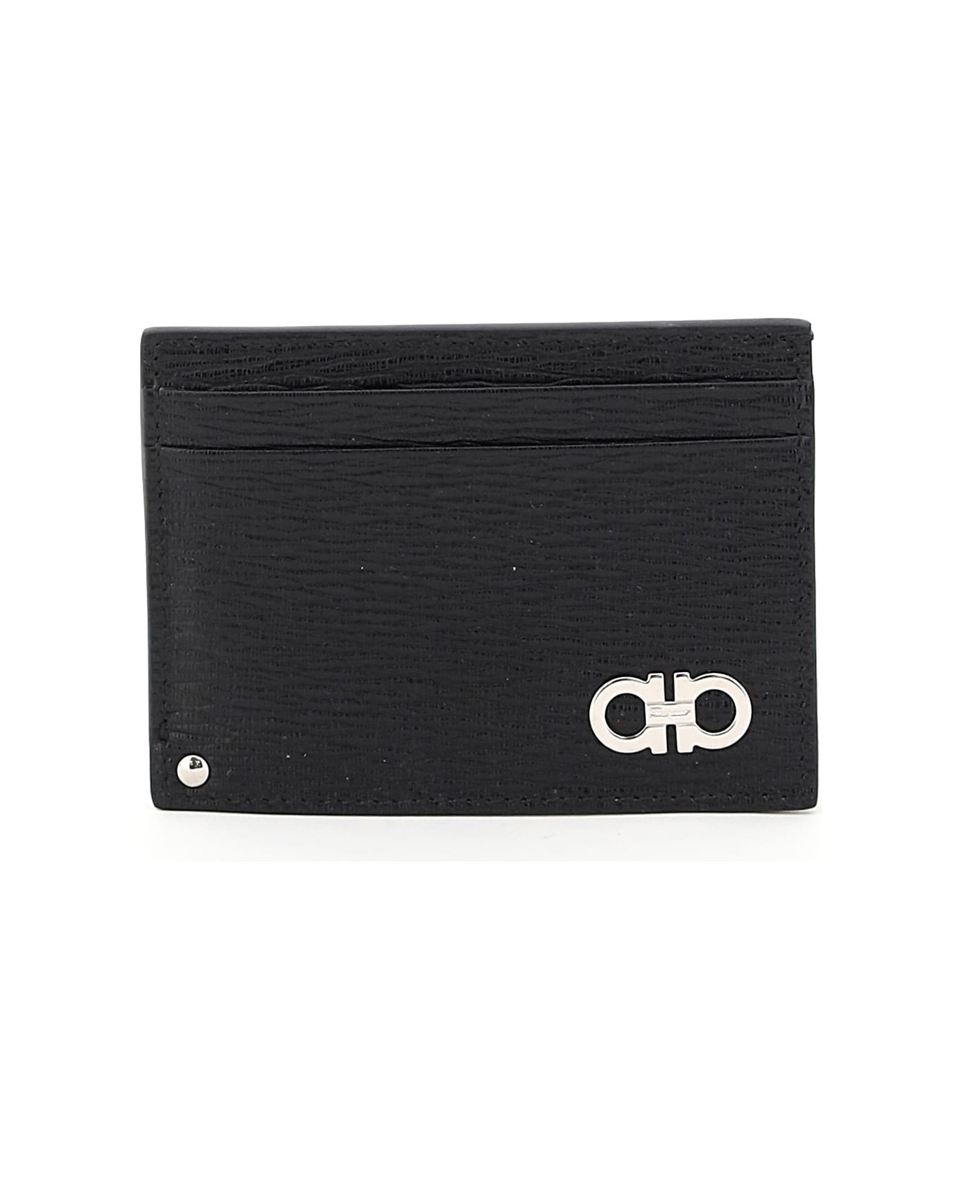 Salvatore Ferragamo card holder in textured leather with the iconic palladium-finish metal Gancini applied on the front, four credit card slots and logo embossed on the back. Interior lined in contrasting leather with L-shaped compartment and an extractable window pocket with metal joint. Composition: 100% vitello