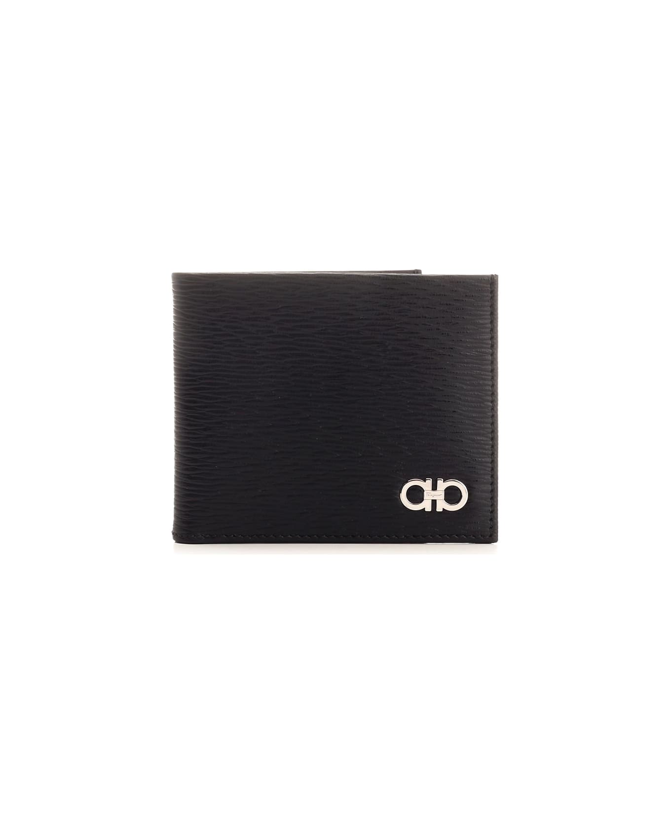 Black hammered calfskin Gancini wallet from Ferragamo, featuring metal Gancini detail on the front, bill compartments, flat document pockets and credit card slots. Composition: 100%CALF 60%CALF 40%FABRIC LINING (100%RAYON)