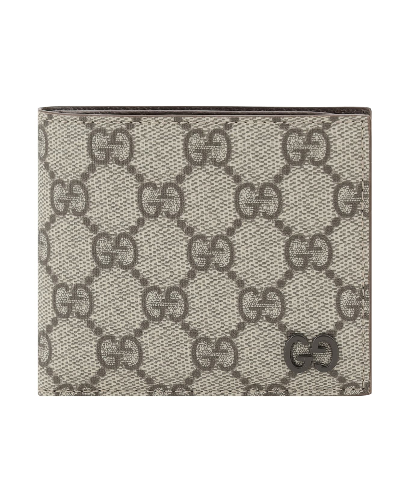 The gucci wallet is a sophisticated and versatile accessory, featuring the iconic gg supreme logo print in jacquard that covers the entire surface, making it instantly recognizable and a symbol of luxury. inside, the leather lining adds a touch of sophistication, while the interior card slots and bill compartment offer optimal management of essentials. the design is complemented by the embossed gg logo plaque on the front, which lends an additional distinctive, high-quality detail.