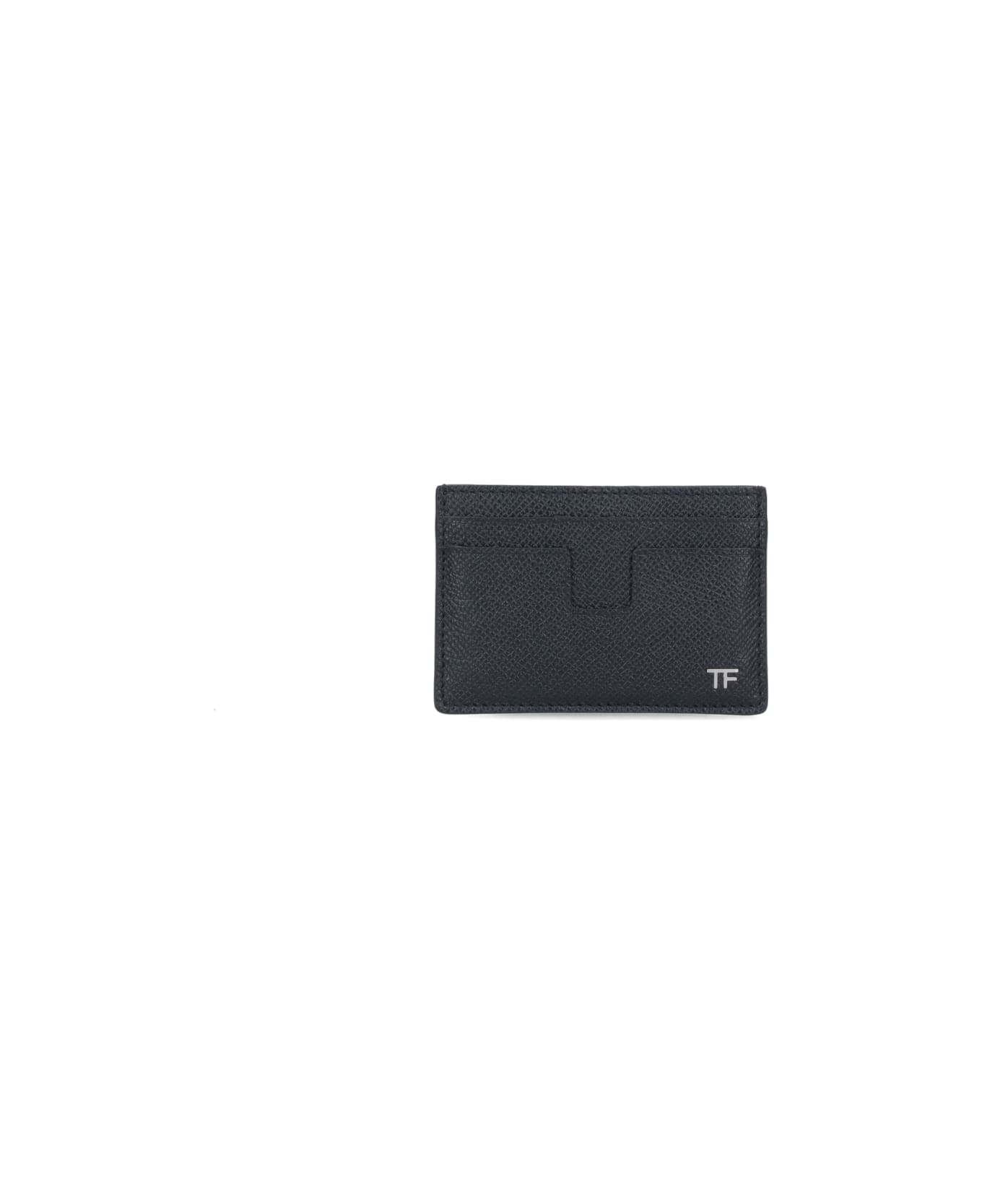 Tom Ford logo card holder in black hammered leather with center flat pocket, silver logo on the front, two card slots on the front, two card slots on the back.