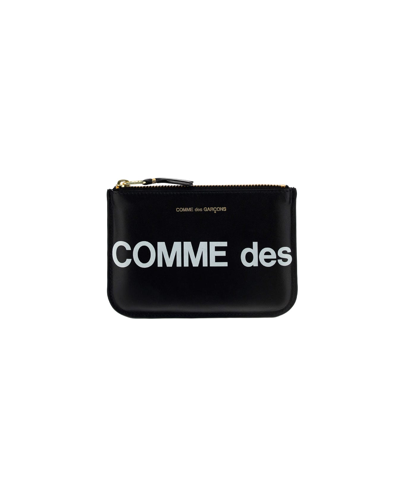 Calfskin mini pouch by comme des garçons, featuring white logo printed on front continuing on back, engraved golden logo on front, zip closure and one internal compartment.