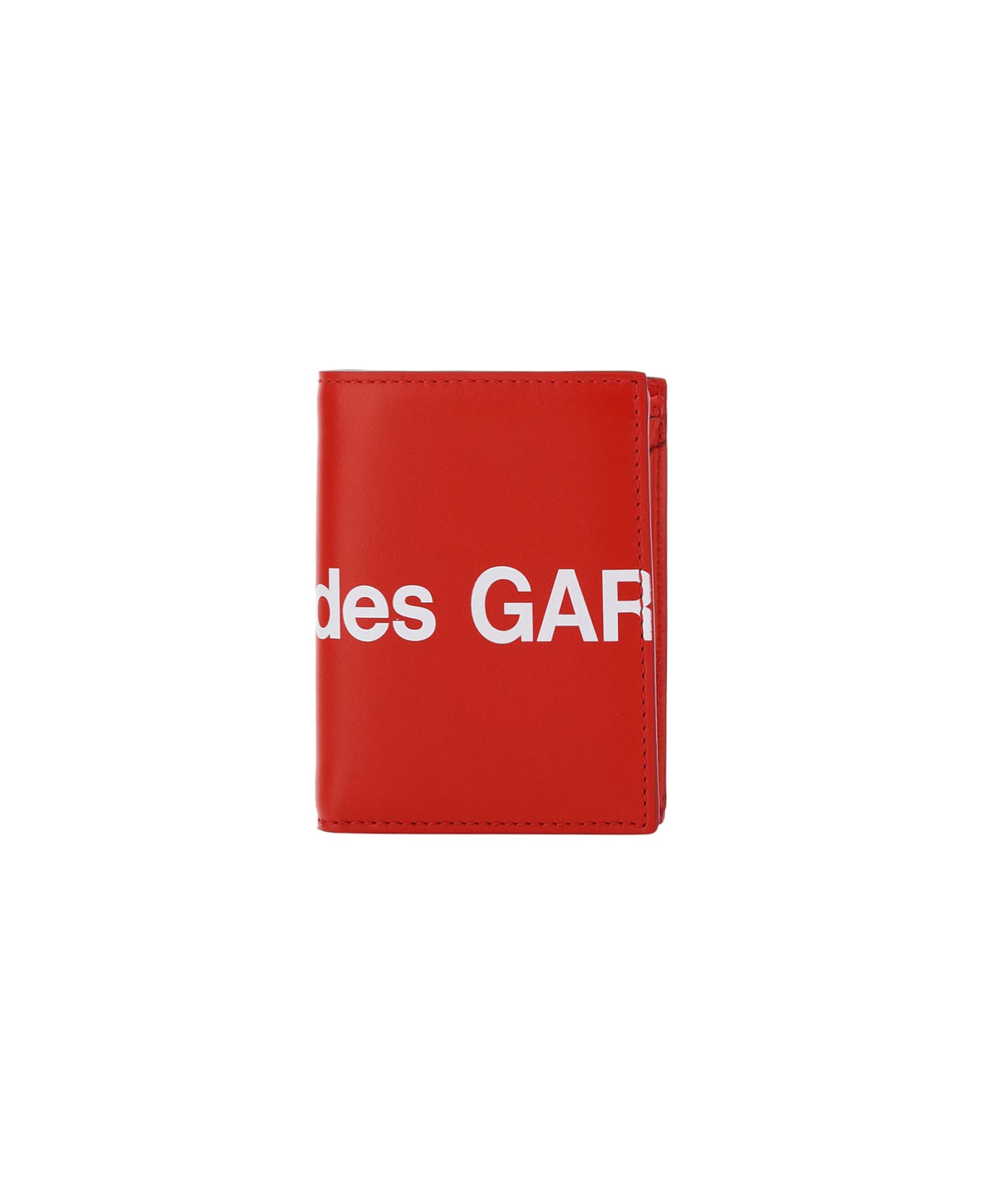 Calfskin wallet by comme des garçons, white logo printed on front continuing on inside, one internal bill compartment and card slots, golden engraved logo. Composition: 100% % Calf Leather Bos Taurus