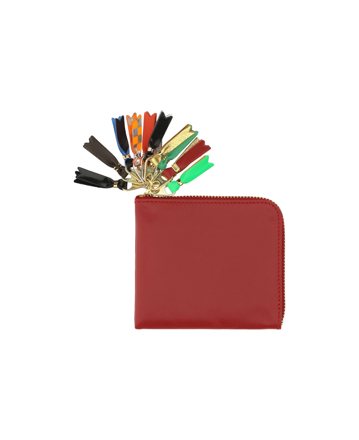 Calfskin wallet by comme des garçons, round zipper opening, multicolored tassel with dangling charms, double interior compartment, iconic brand monogram printed in contrasting pressure inside.
