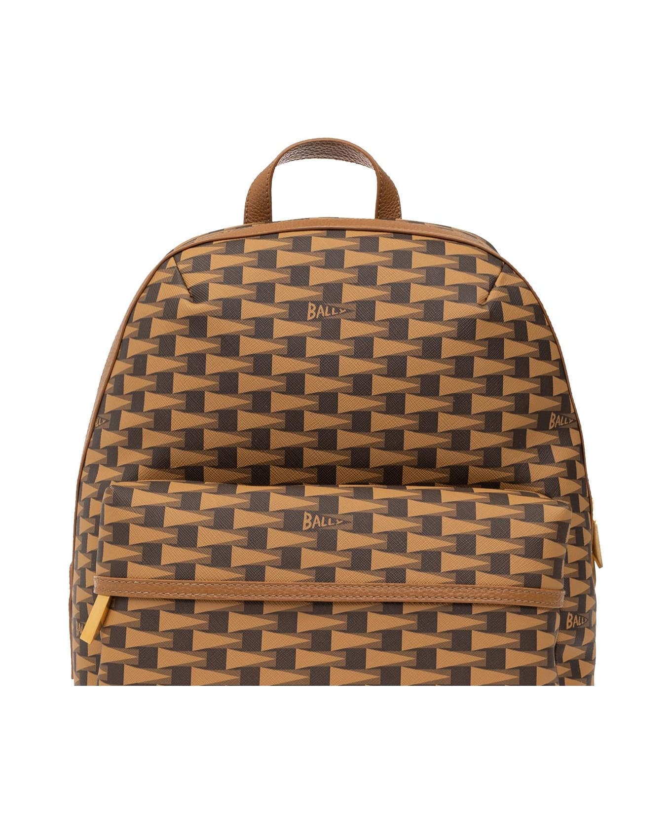 Brown and black backpack from Bally. Made of coated canvas and leather, this design fastens with a two-way zip and showcases a logo pattern, adjustable shoulder straps, a short handle, gold-tone metal hardware and one internal compartment with four slip p