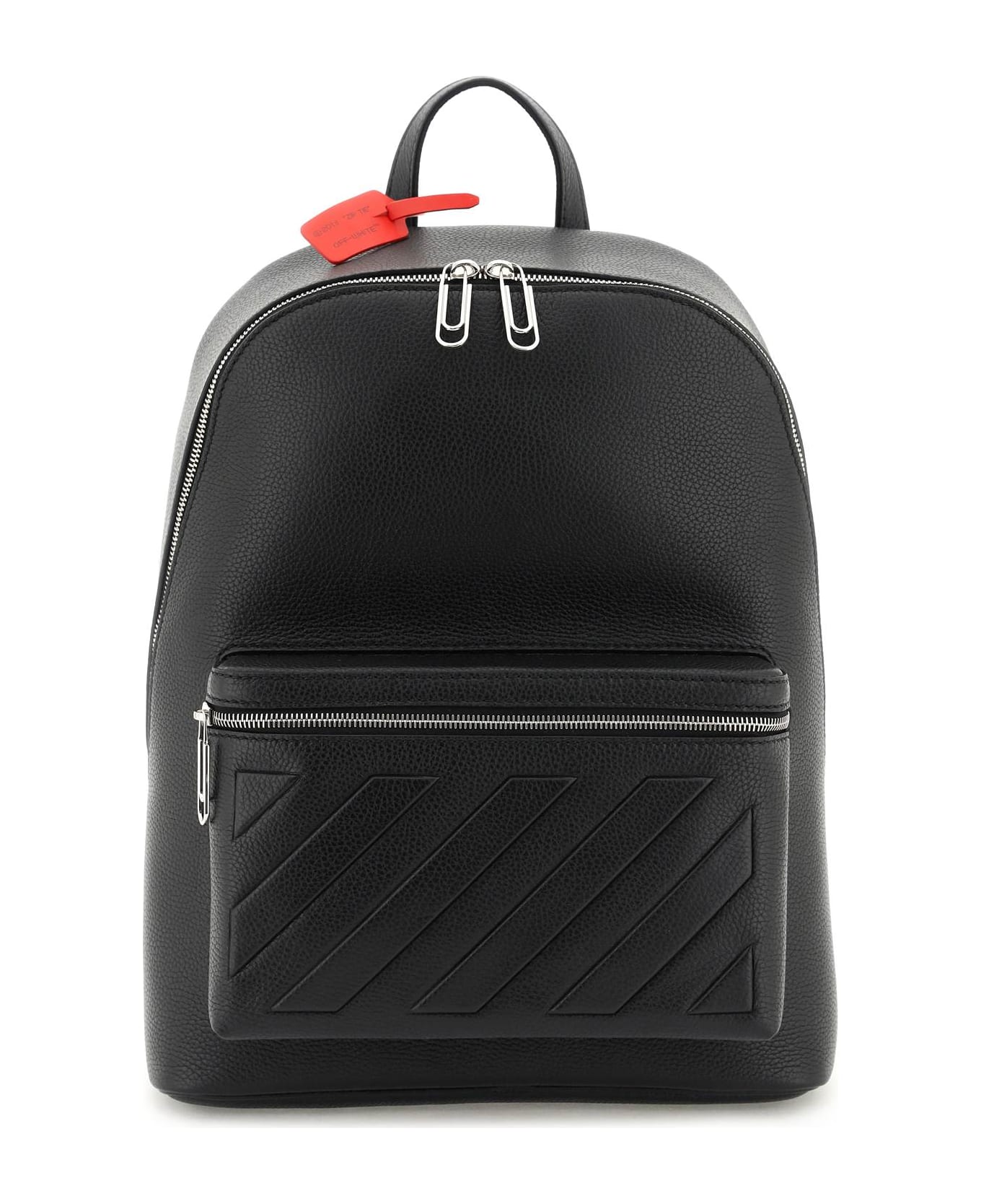 Off-white "Binder" backpack crafted in grained leather with main compartment with two-way zippered closure, canvas interior with one snap-button pocket and front zippered pocket. Paperclip zip-pullers, top handle and adjustable shoulder straps. Back lettering logo and Silver-finished metalware.