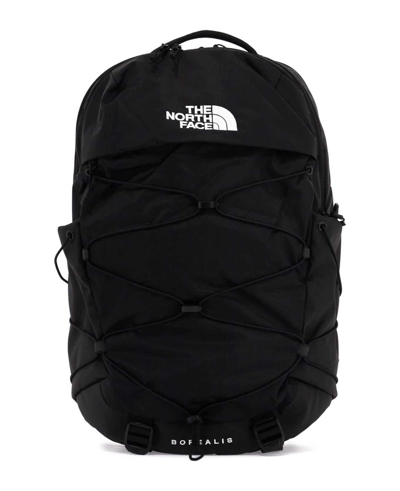 Borealis backpack by The North Face crafted from recycled ripstop nylon with contrasting embroidered lettering logo on front pocket. It features a protected laptop compartment, a storage panel, zippered pockets, two external water bottle holders, including one with quick smartphone access, and an external fleece-lined pocket. Padded back with FlexVent