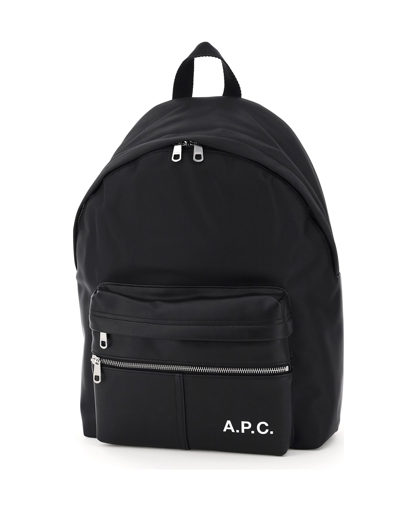 A. P. C. Camden backpack in nylon fabric with contrasting logo print on the front faux leather pocket composed of two zipped compartments. Fabric top handle, adjustable shoulder straps, two-way zip closure and lightly padded back. Fabric lined interior with a flat laptop compartment. Silver-finished metalware.