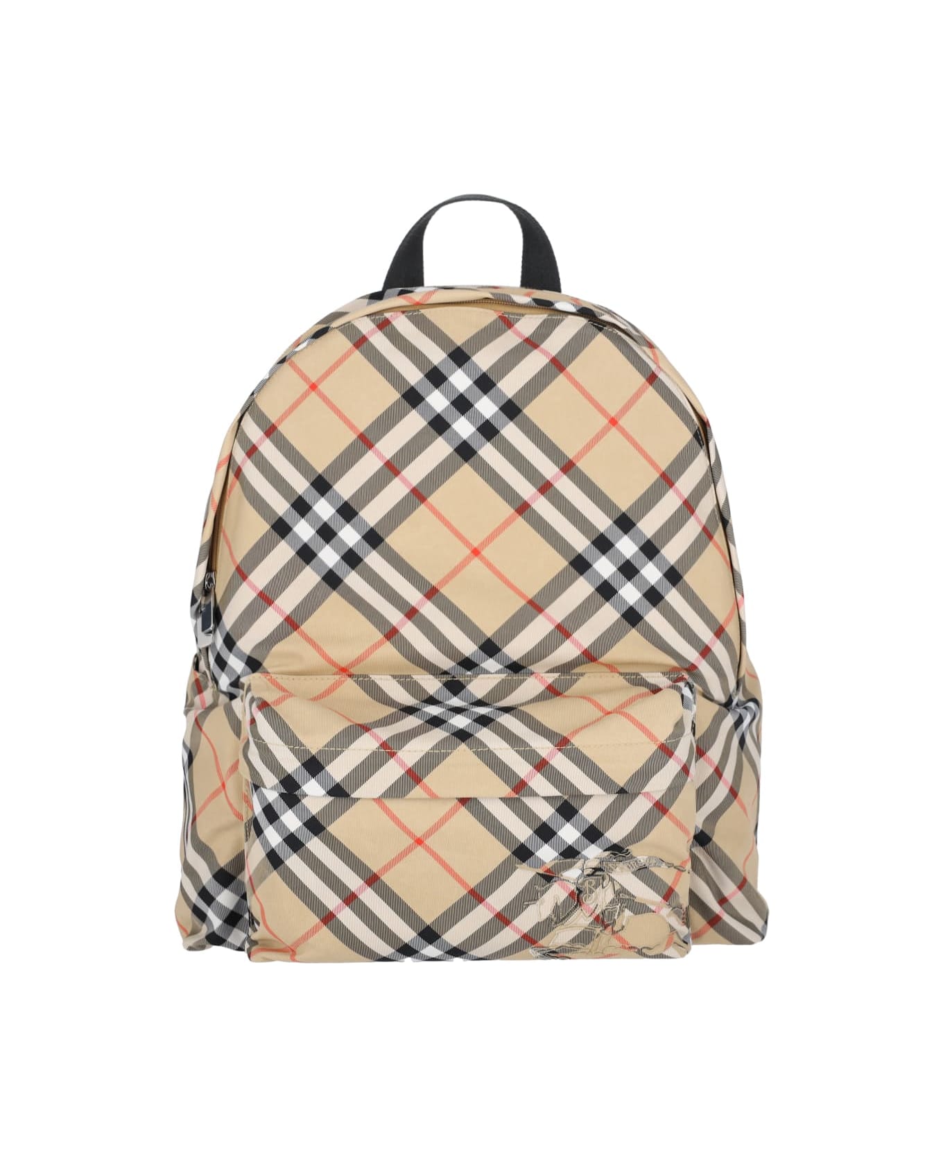 Burberry 'Check' backpack in beige fabric with iconic all-over pattern, tape top handle, front zip flap pocket, tonal EKD logo patch detail, two side flat pockets, adjustable shoulder straps at the back, zip closure, main inner compartment.