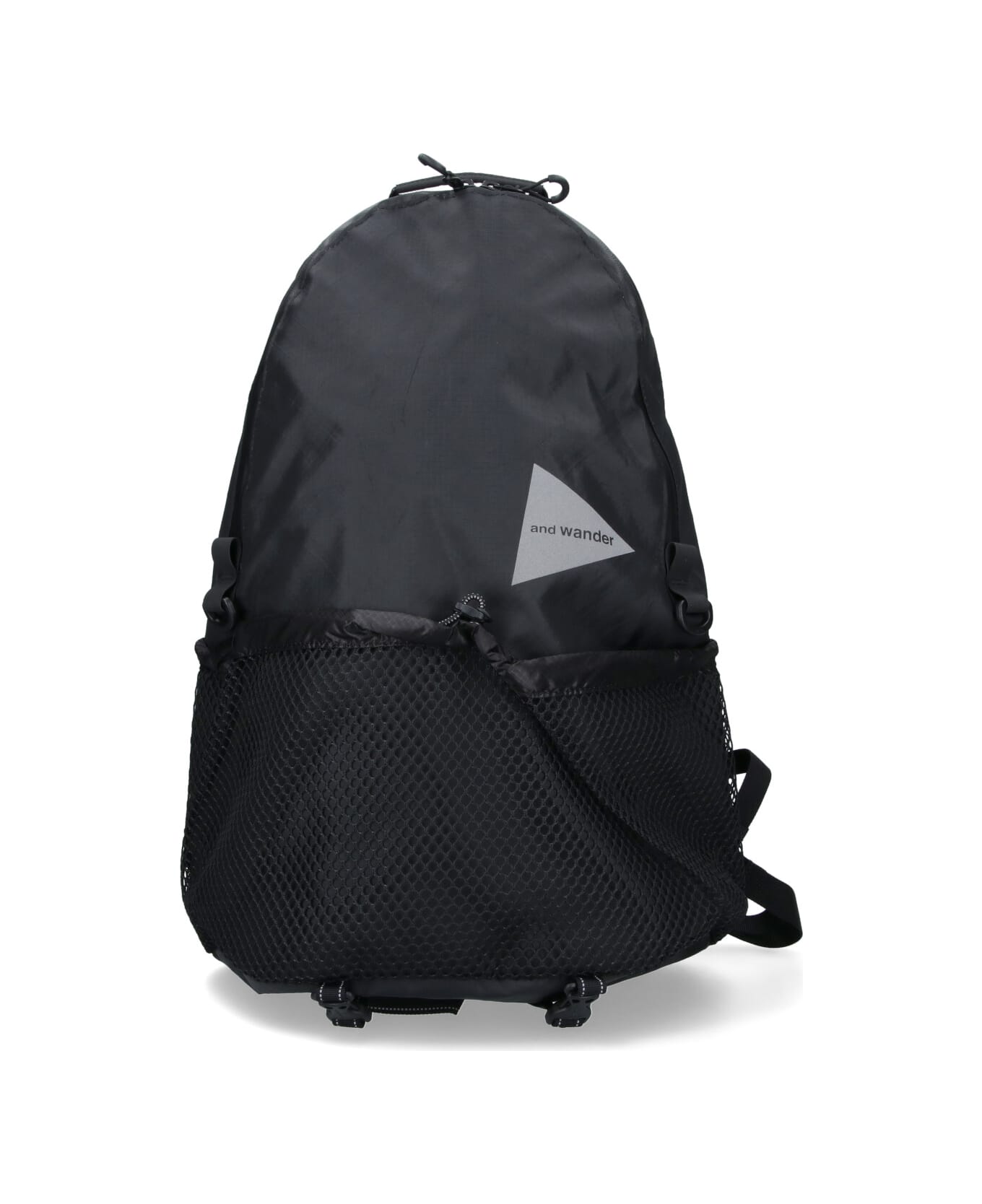 And Wander 'ECOPAK 20L' backpack in black fabric with top handle, adjustable shoulder straps and buckles, double zip closure, contrast triangle logo detail at the front, maxi mesh drawstring pocket at the front, inner zip pocket, main inner compartment.