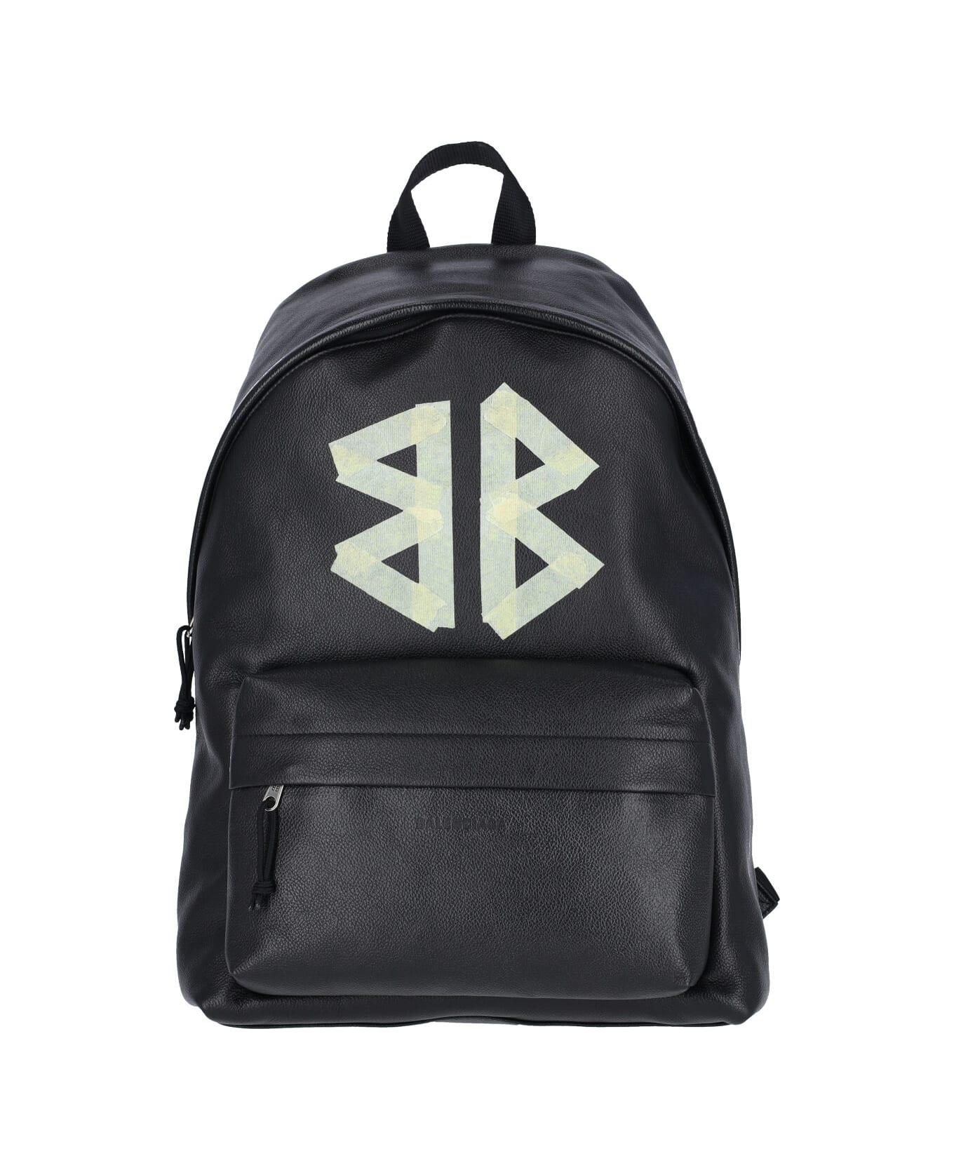 Balenciaga 'Explorer' backpack in black hammered leather with handle, two adjustable back shoulder straps, double zip closure, contrast 'Tape Type' logo print on the front, front zip pocket, inner flat pocket, inner zip pocket, main inner compartment.