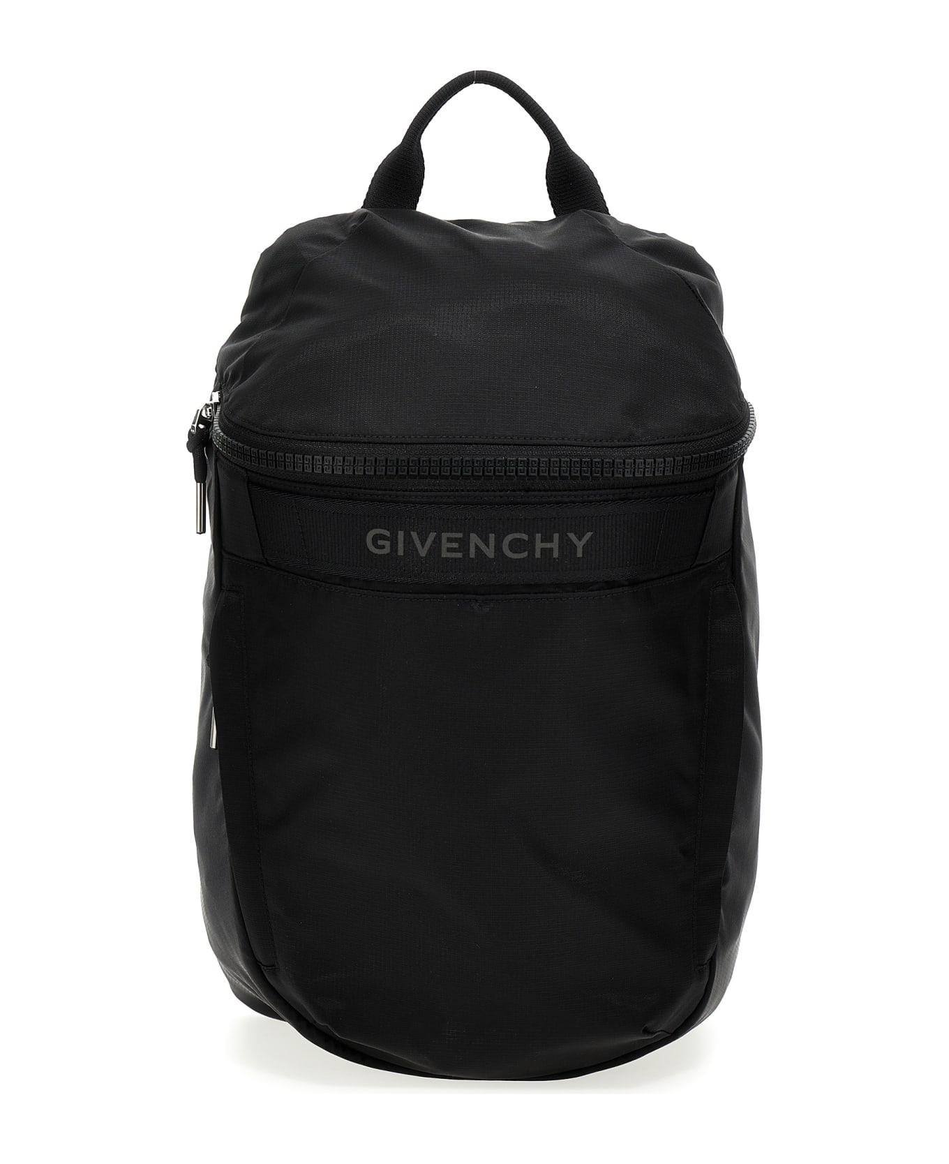 G-Trek' ripstop nylon backpack with top handle, a strip band with front reflective logo, a decorative zip closure, adjustable canvas shoulder straps with jacquard logo, two zippered side pockets, smooth calf leather details and silver metal.