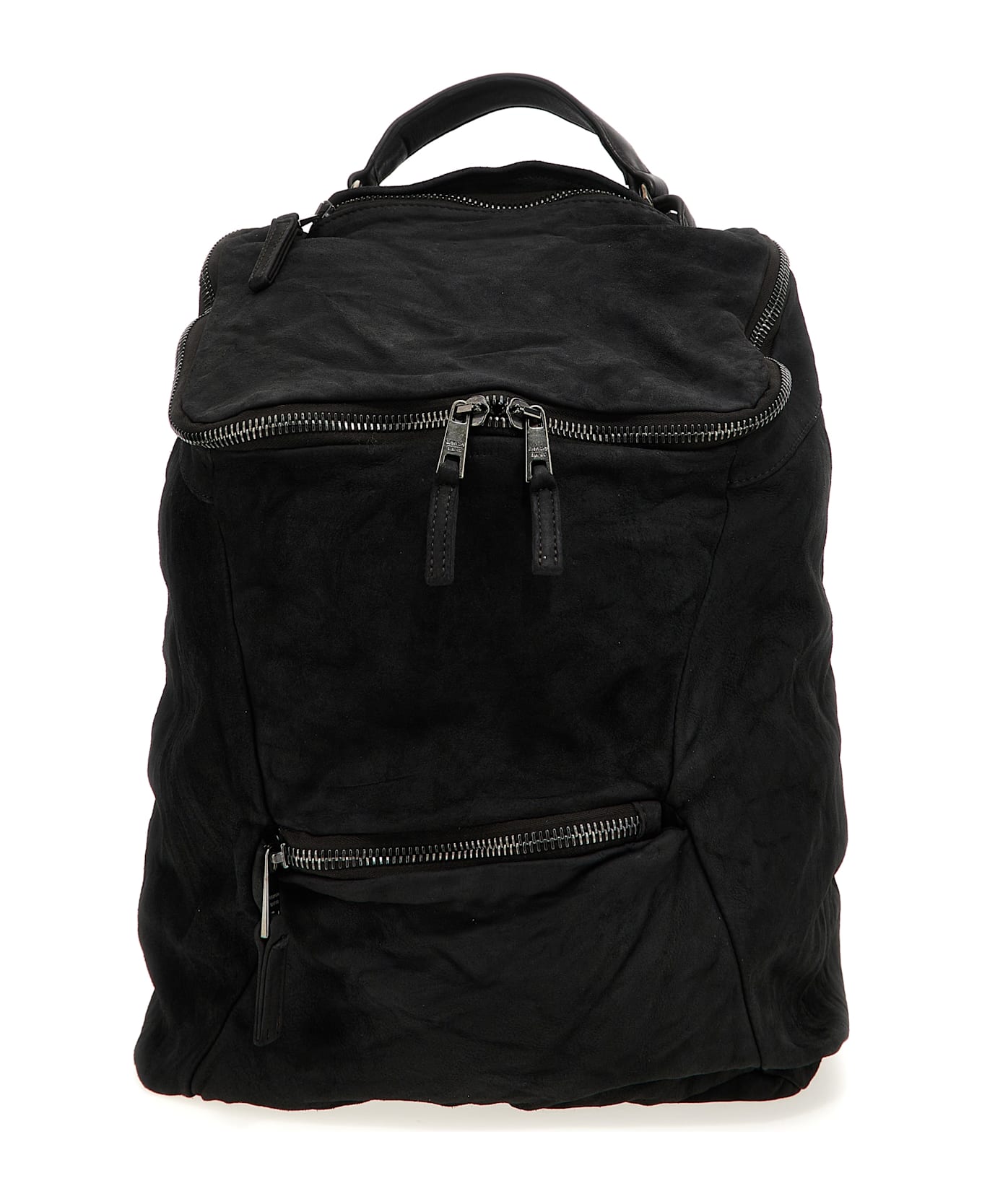 Leather backpack, square zip closure, external zip pockets, adjustable shoulder straps, fixed handle.