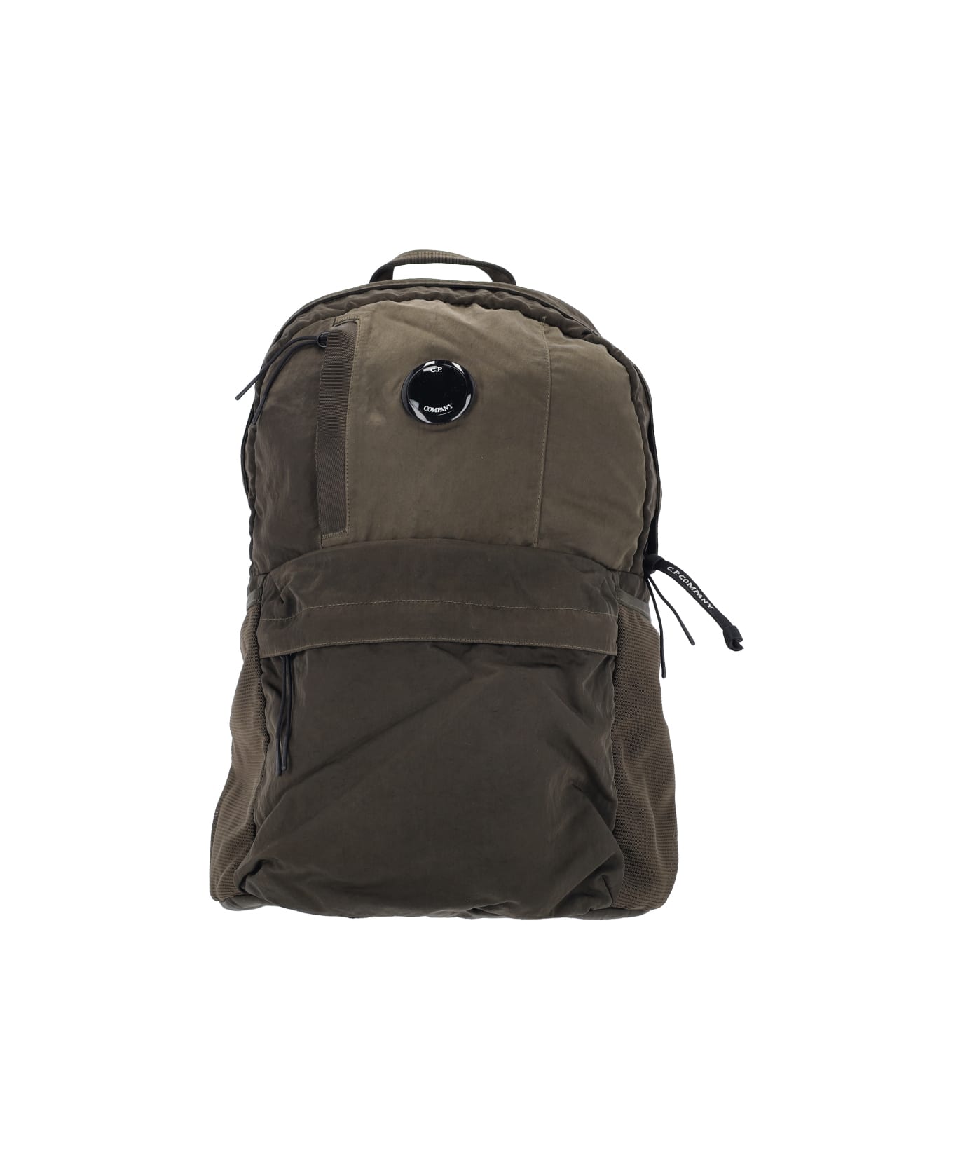 Green fabric Nylon B Lens backpack, top handle, zip closure, front Lens detail, back shoulder straps, back buckle, front zip pocket, two side mesh pockets, inner flat pocket, single main inner compartment.