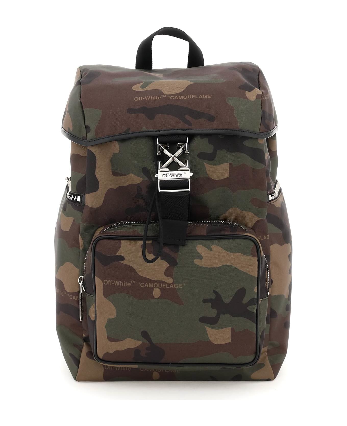 Off-White backpack in camouflage nylon with leather trimmings and lid flap with front metal Arrows tuc buckle with engraved lettering logo. Front and side pockets with zip closure and "Paper clip" zip puller. Front leather logo tag with meteor holes. Single handle, padded adjustable shoulder strap and back in padded technical fabric. Drawstring closure under the flap and nylon-lined interior with one zipped pocket and a leather credit card pocket. Antique silver-finished metalware.
