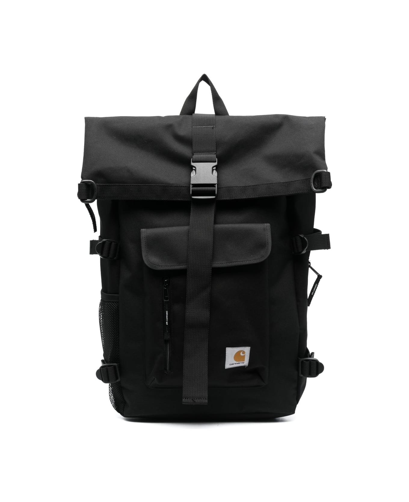 jet black recycled polyester logo patch to the front mesh panelling single top handle adjustable shoulder straps front flap pocket two side patch pockets side buckle fastening front buckle fastening concealed top zip fastening main compartment internal padded laptop pocket adjustable fit
