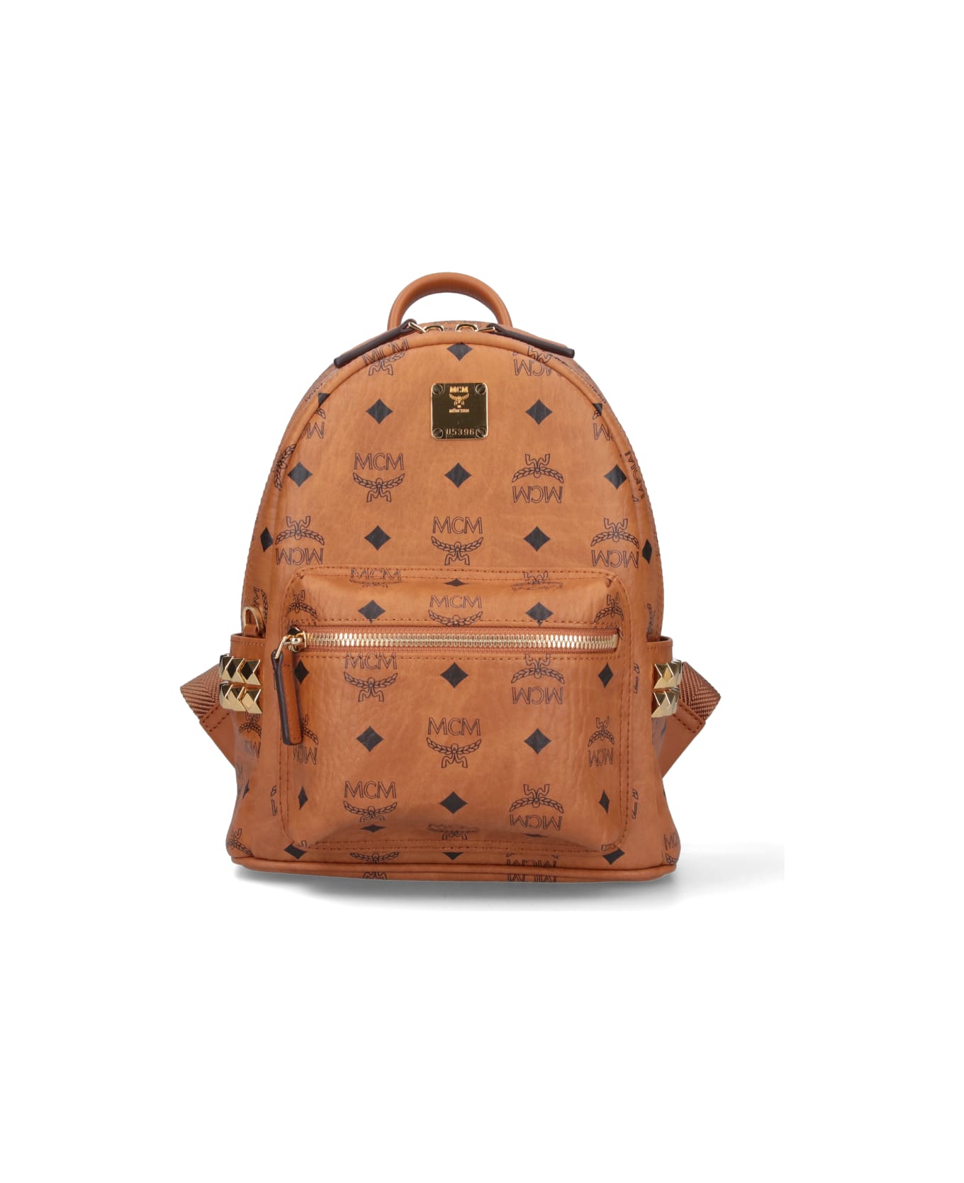 MCM Stark backpack in brown fabric with all-over 'Visetos' pattern, top handle, two adjustable back shoulder straps, two side pockets with metal stud detail, front zip patch pocket with logo plaque detail, and main inner compartment.