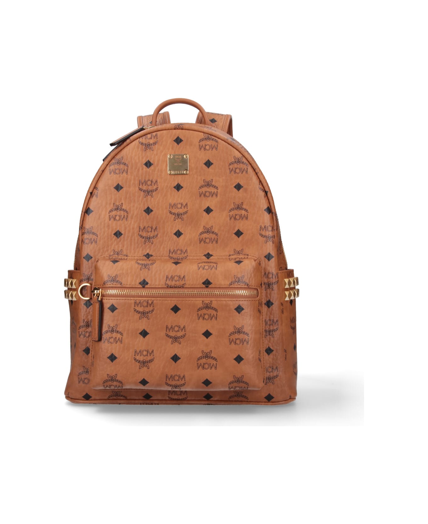 Stark backpack MCM brown monogram "visetos" fabric with adjustable shoulder straps, top handle, zip closure, gold metal logo hardware, front zip pocket, two side pockets, gold metal studs detail, inner flat pocket, main inner compartment.