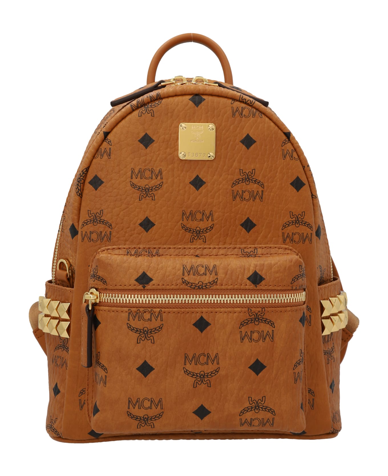 'Stark Visetos' backpack with all-over logo print, zip closure, gold hardware, adjustable shoulder straps.