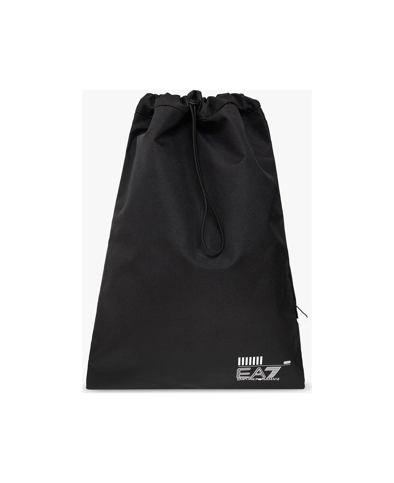 Black backpack from EA7 Emporio Armani, the 'Sustainable' collection. Made of fabric, this design features drawstrings, a white logo print, adjustable shoulder straps and one internal compartment with one zip pocket.