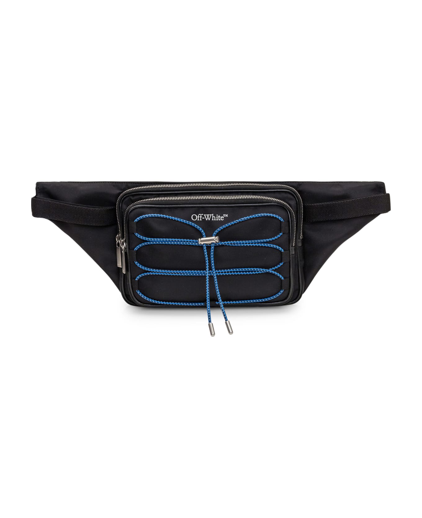 Black belt bag. Adjustable shoulder strap with buckle. Two zip compartments. Zip pocket. Drawstring and logo on the front.