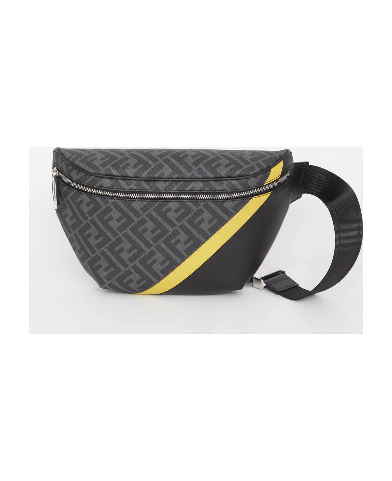 FF fabric belt bag in the shades of grey with a black leather insert, a yellow leather insert and mesh back. It features zip closure, adjustable strap with Fendi logo and one interior zip closure.