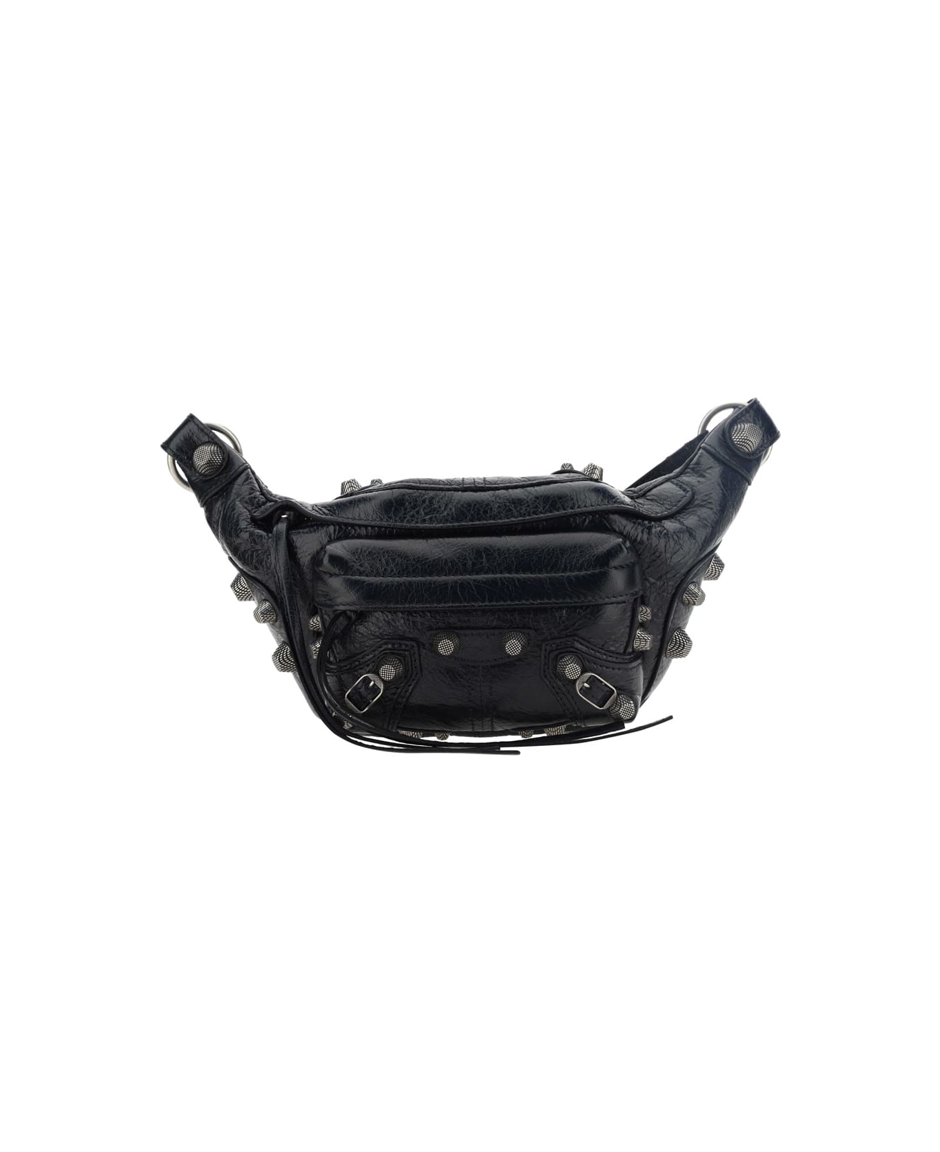 Lambskin le cagole fanny pack by balenciaga, grained leather design, adjustable and removable belt-style shoulder strap, all-over silver-tone details and studs, top zipper closure, front patch pocket with zipper closure.