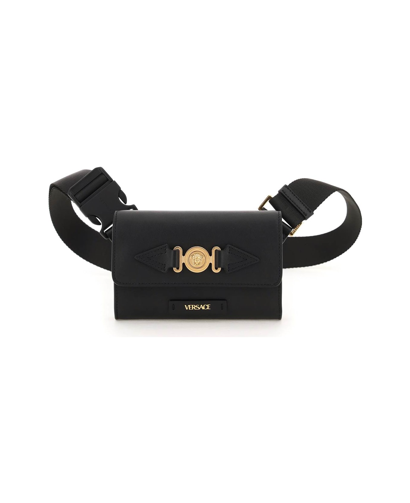 Medusa Biggie belt bag by Versace crafted in leather with metal detail with the iconic three-dimensional Medusa head and leather tag with gold-tone logo print. Adjustable webbing belt with plastic snap buckle, flap with magnetic button closure, cotton lining and three inner leather credit card slots. Gold-finished metalware.