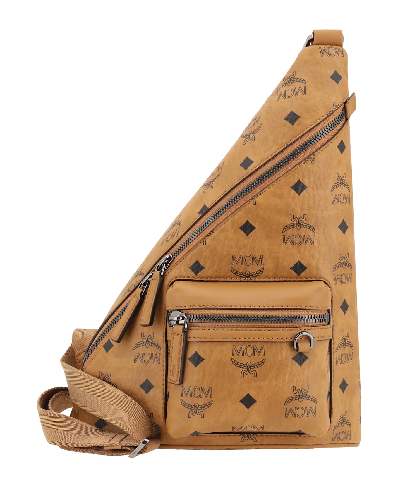 Leather one-shoulder backpack by mcm features a geometric design. the double-slider zipper that runs the length of the bag is functional and modern, allowing quick and secure access to items inside. the padded, adjustable shoulder strap adds comfort and practicality. the zippered pocket located on the front is an additional distinguishing feature along with the iconic mcm monogram repeated throughout.