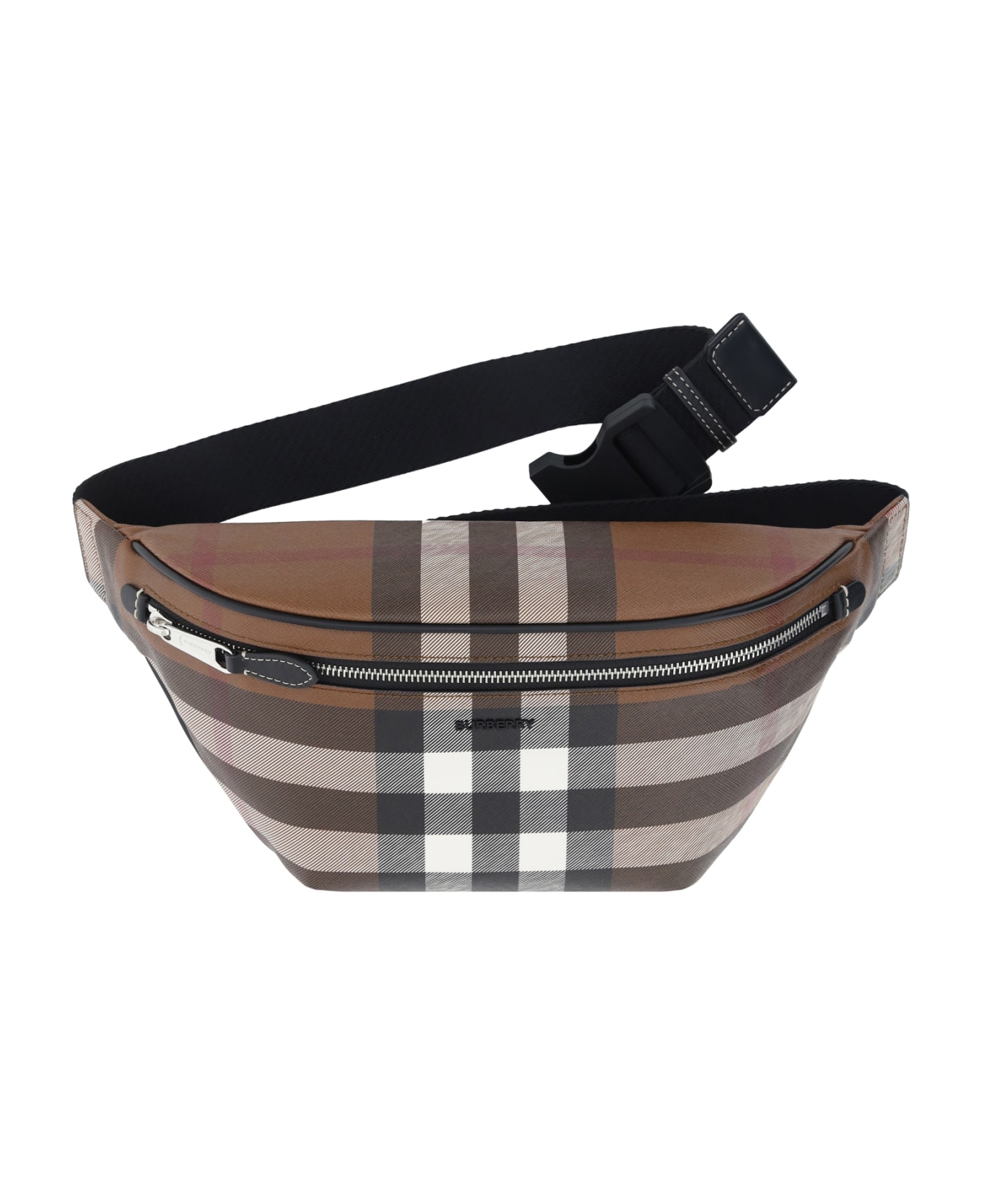 Cason belt bag by burberry, iconic all-over applied brand monogram, front zipper opening, flat back pocket with zipper closure, adjustable fabric belt, clip closure, interior flat leather pocket.