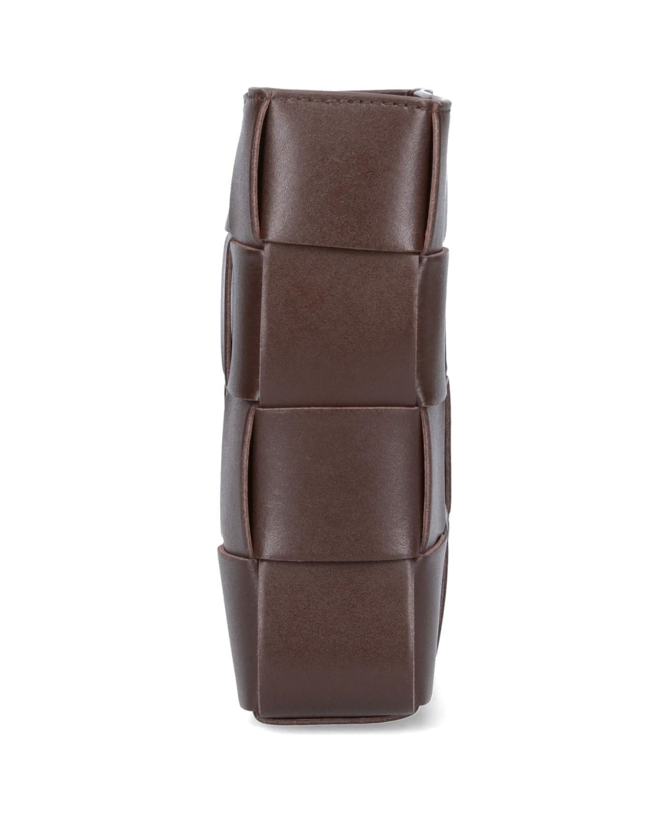 Bottega Veneta mini 'Cassette' bag in brown woven leather with adjustable shoulder strap, magnetic closure, and interior compartment.