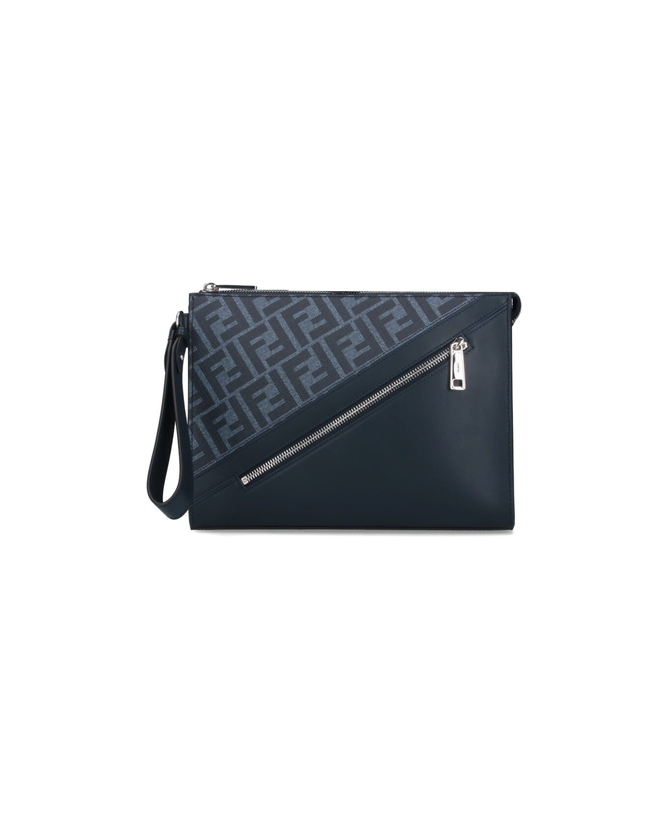 Fendi 'Diagonal' flat pouch in blue cotton blend with tonal logo pattern, leather trim, zip closure, front zip pocket, removable side strap, single inner compartment. Composition: 43% Cotton, 14% Polyester, 43% Polyurethane
