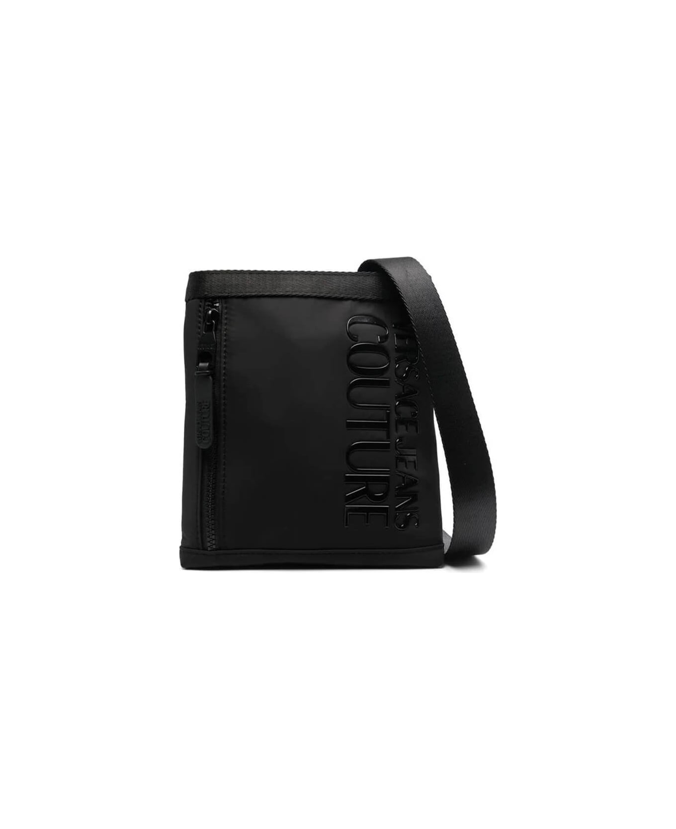 Crossbody bag by Versace Jeans Couture made of black nylon. It features a zipped main compartment and a flat pocket on the front, tone-on-tone embossed logo and adjustable fabric shoulder strap. Measures 21x20x2 cm.