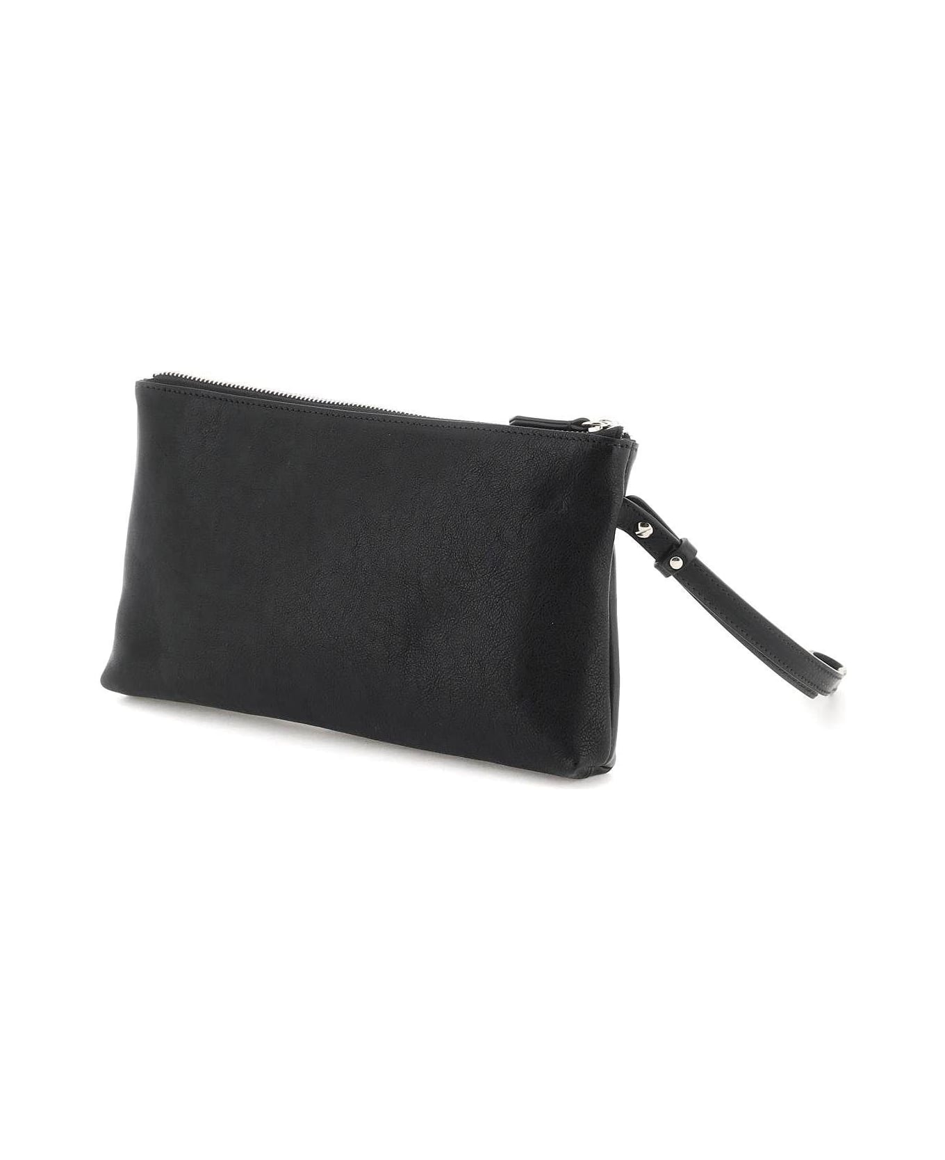 Il Bisonte pouch made of leather with zippered closure, fabric interior with one open pocket and detachable wrist handle. Silver-finished metalware.