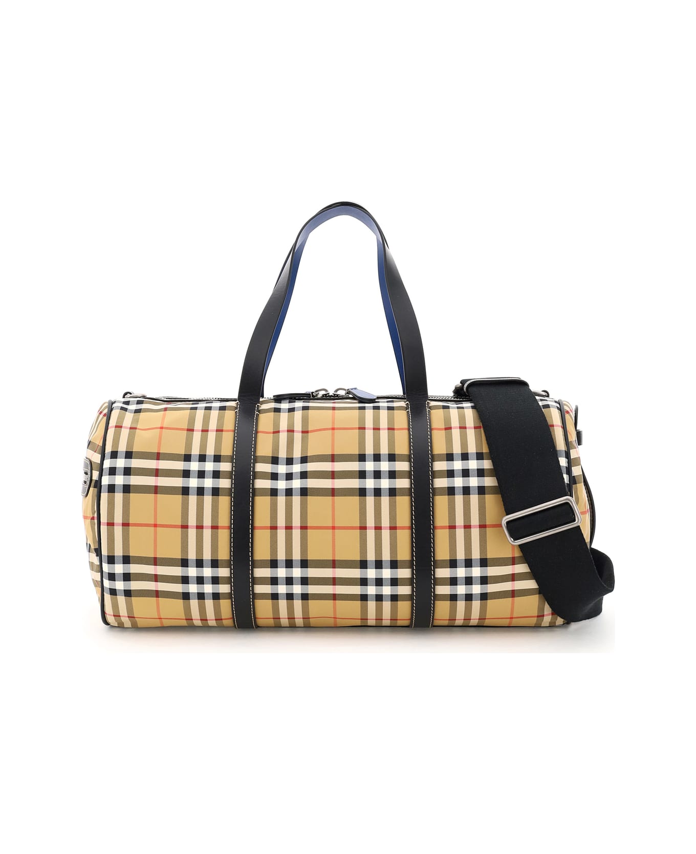 Burberry large nylon duffle bag with all-over Vintage Check and contrast leather hems. Zip closure, contrast leather handles, side leather handle, removable and adjustable fabric strap, side zip pocket, leather base. Nylon lining, inside pockets. Silver-tone metal hardware.