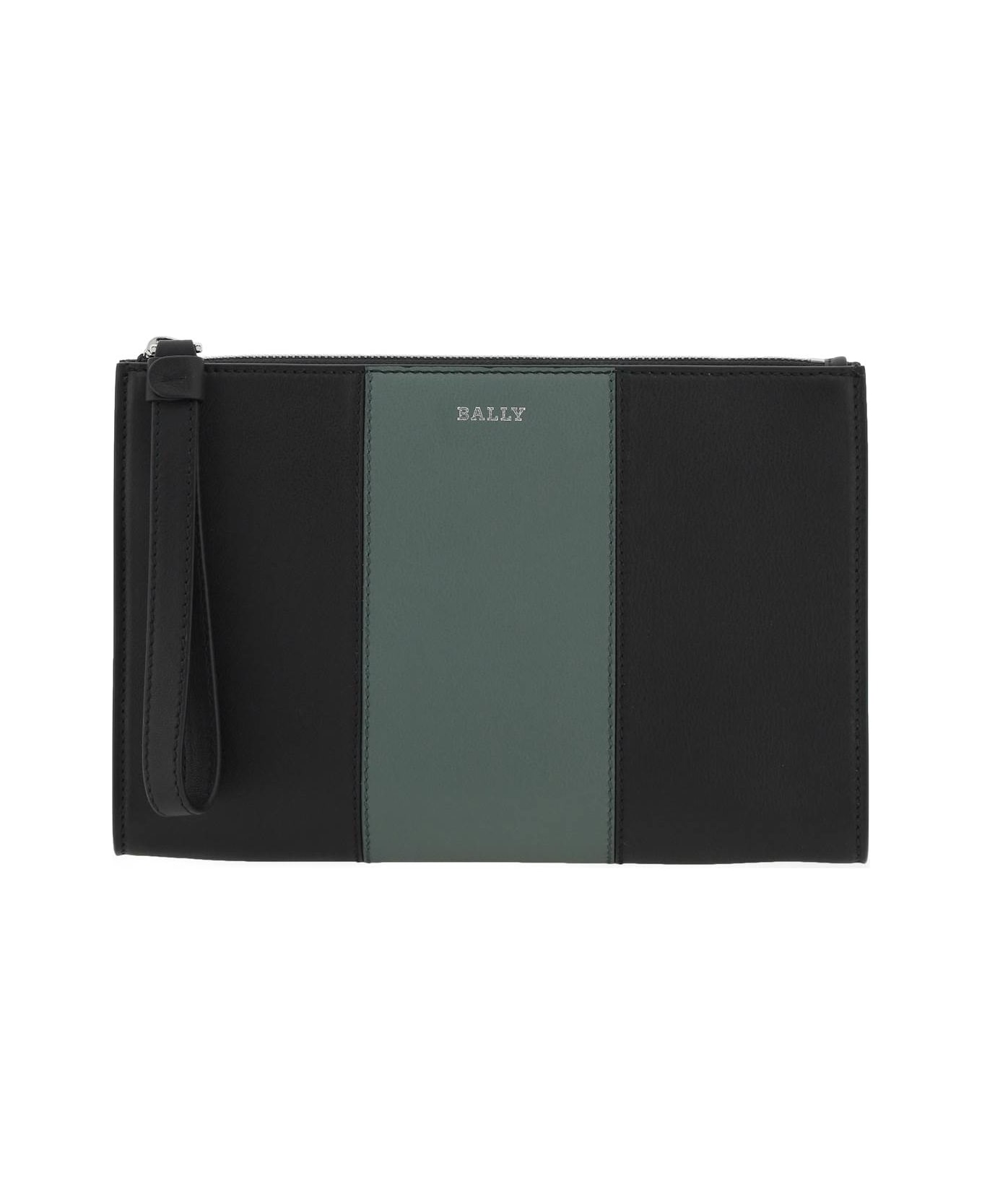 Haig pouch by Bally in grained leather, characterized by the front contrast band insert with silver logo print. Zip closure with maxi leather zip puller which works as a wrist handle and branded fabric-lined interior with an open flat pocket and two small open pockets. Silver-finished metalware.