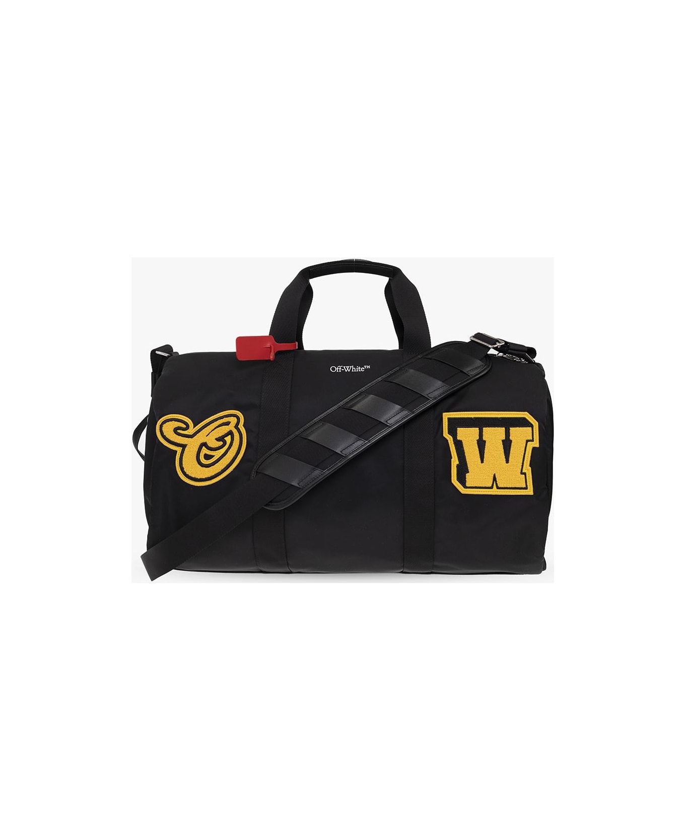 Black 'Hard Core' holdall bag from Off-White. Fastened with a two-way zip, this design is decorated with a white logo print, yellow patches and the brand's signature zip tie in red. It has one front pocket, two handles, adjustable shoulder strap and one i