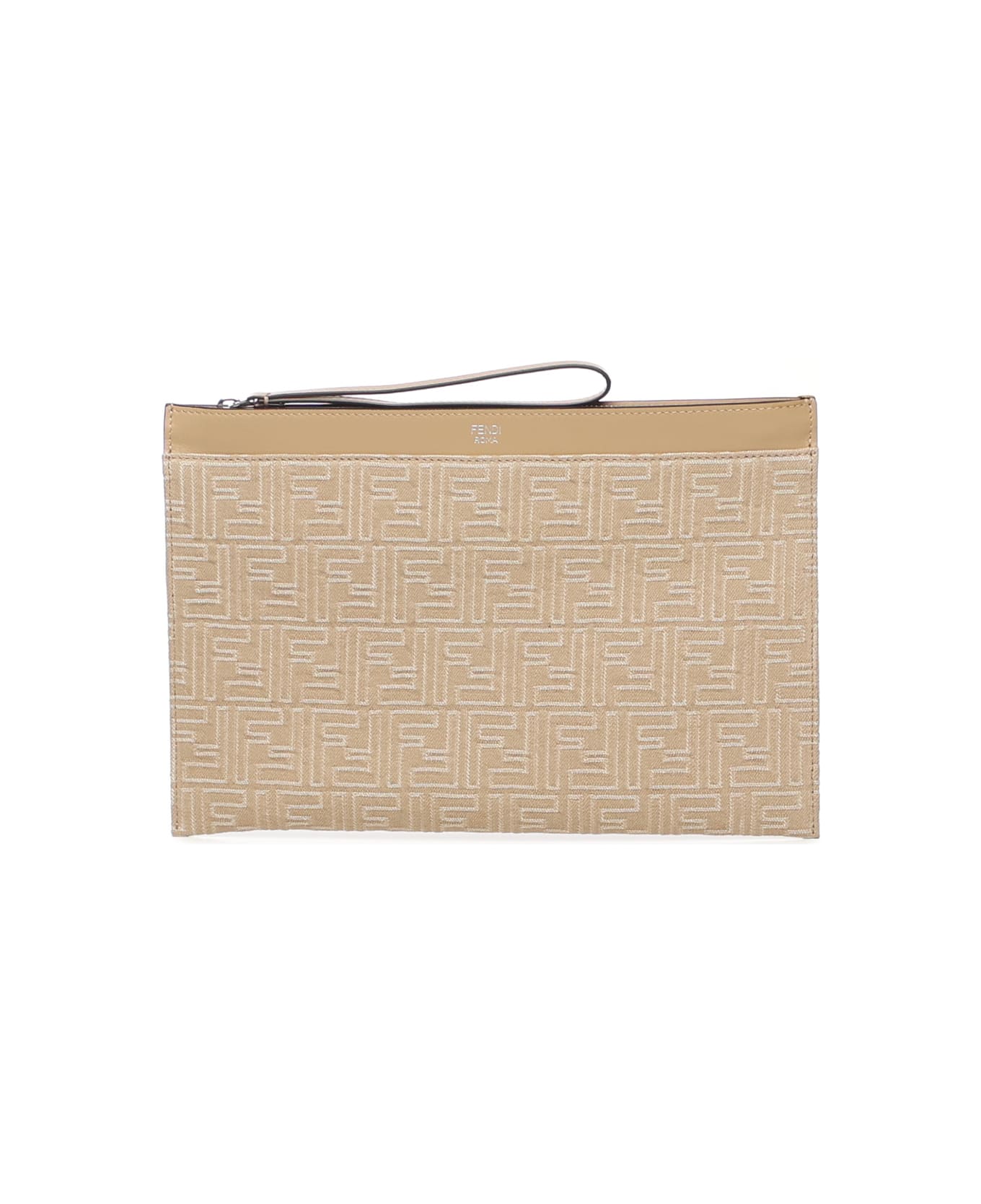 - Made of denim-effect FF jacquard with leather details - Zip closure - Dimensions: 30 x 20. 5 x 1 cm - Made in Italy - Color: Beige