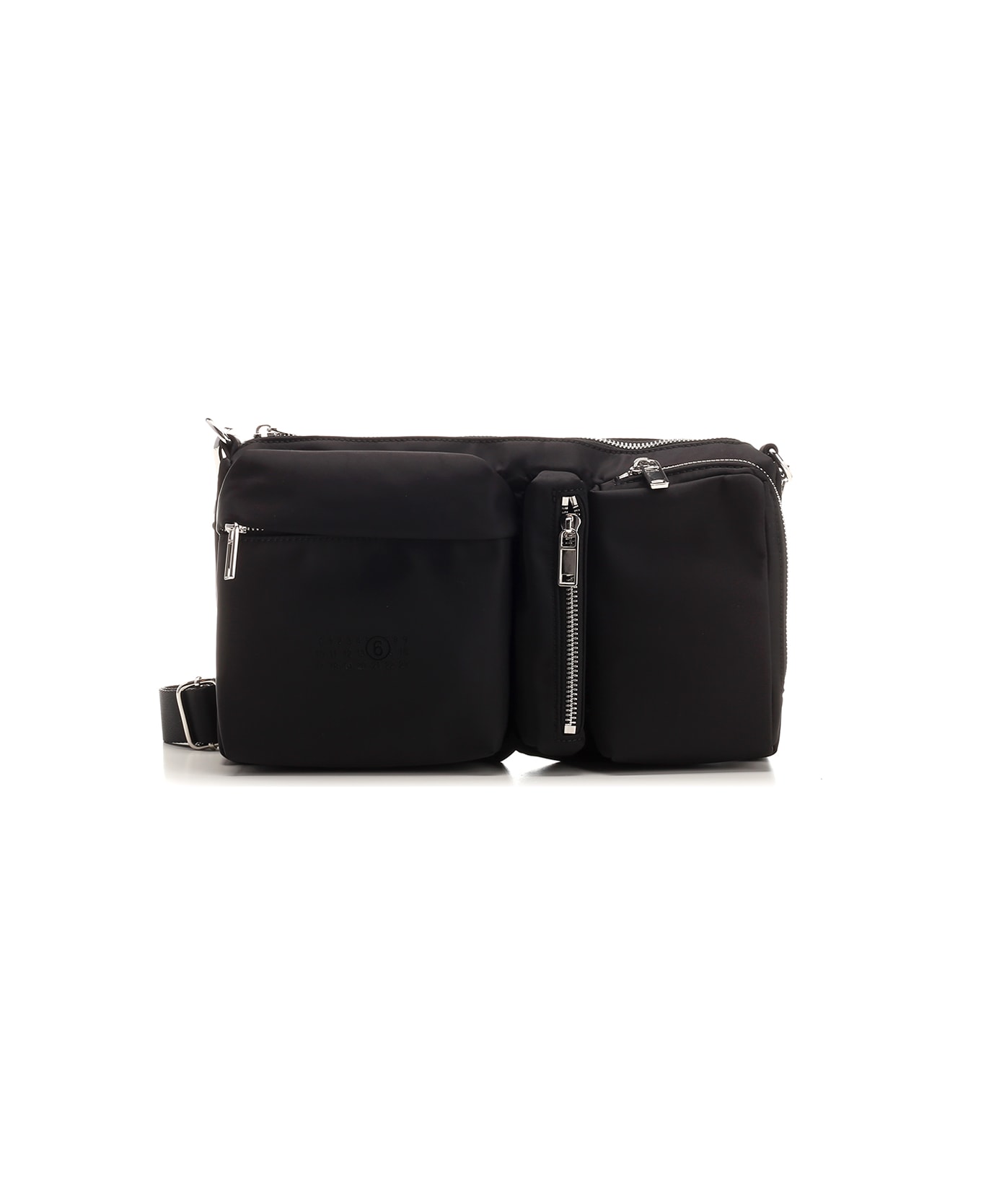 Black 'Messenger' crossbody bag from MM6 Maison Margiela in nylon, front numeric signature, one main compartment, zip pockets, adjustable shoulder strap. Composition: T1 100% PA - T2 100% PA