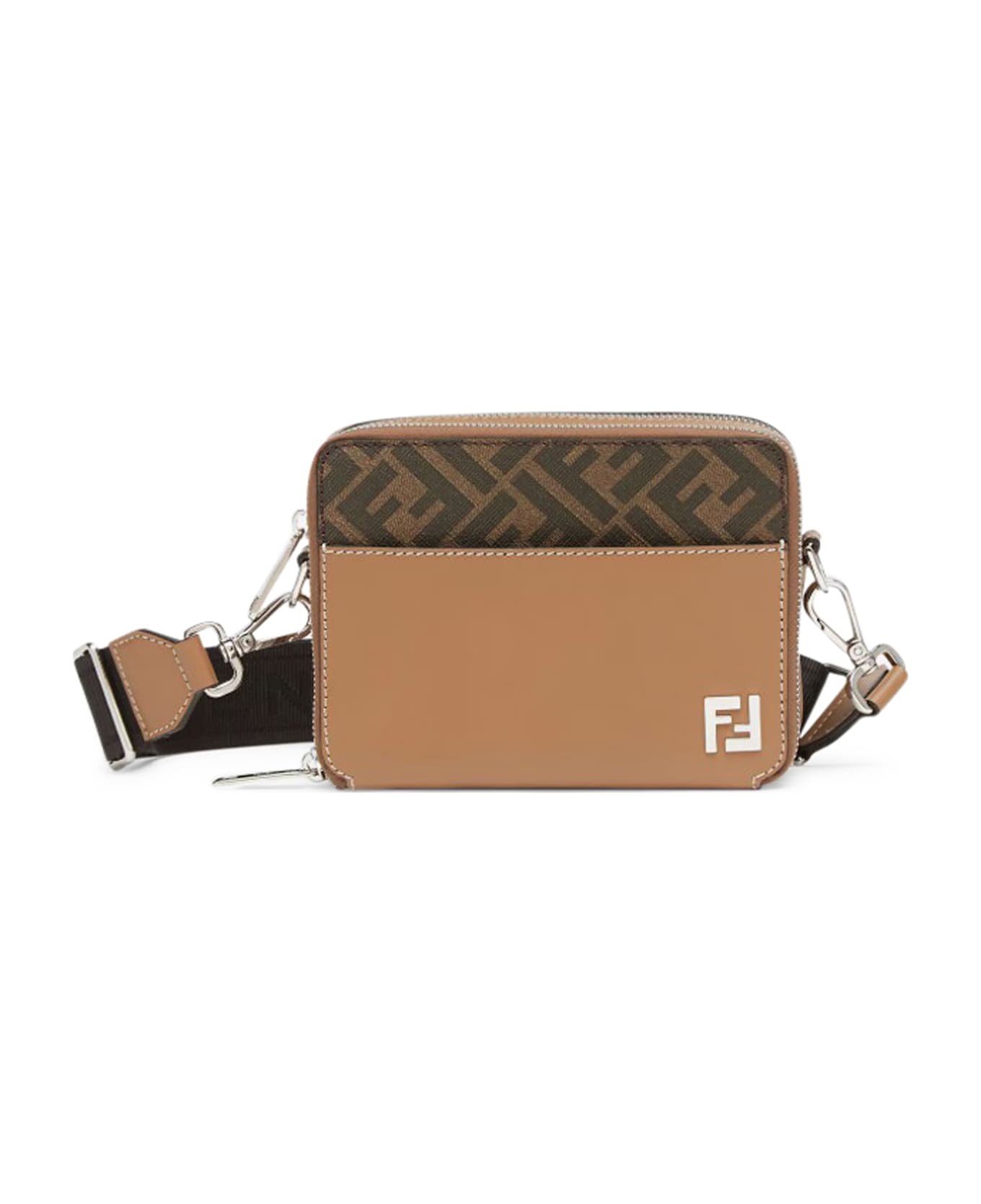 -Compact photo bag made of beige leather and brown FF canvas. Decorated with metal FF application
