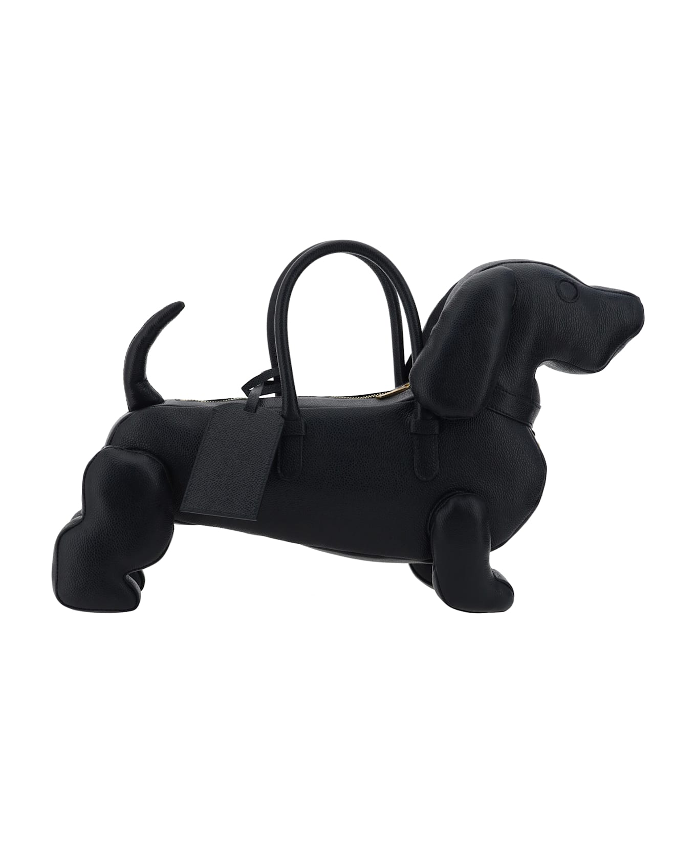 Goatskin hector mini handbag by thom browne, grained leather design, two top tubular handles, zipper closure at top, single interior compartment, metal applique plaque, brand's iconic hector dachshund shape. Composition: 100% % Goatskin/hircus Goatskin