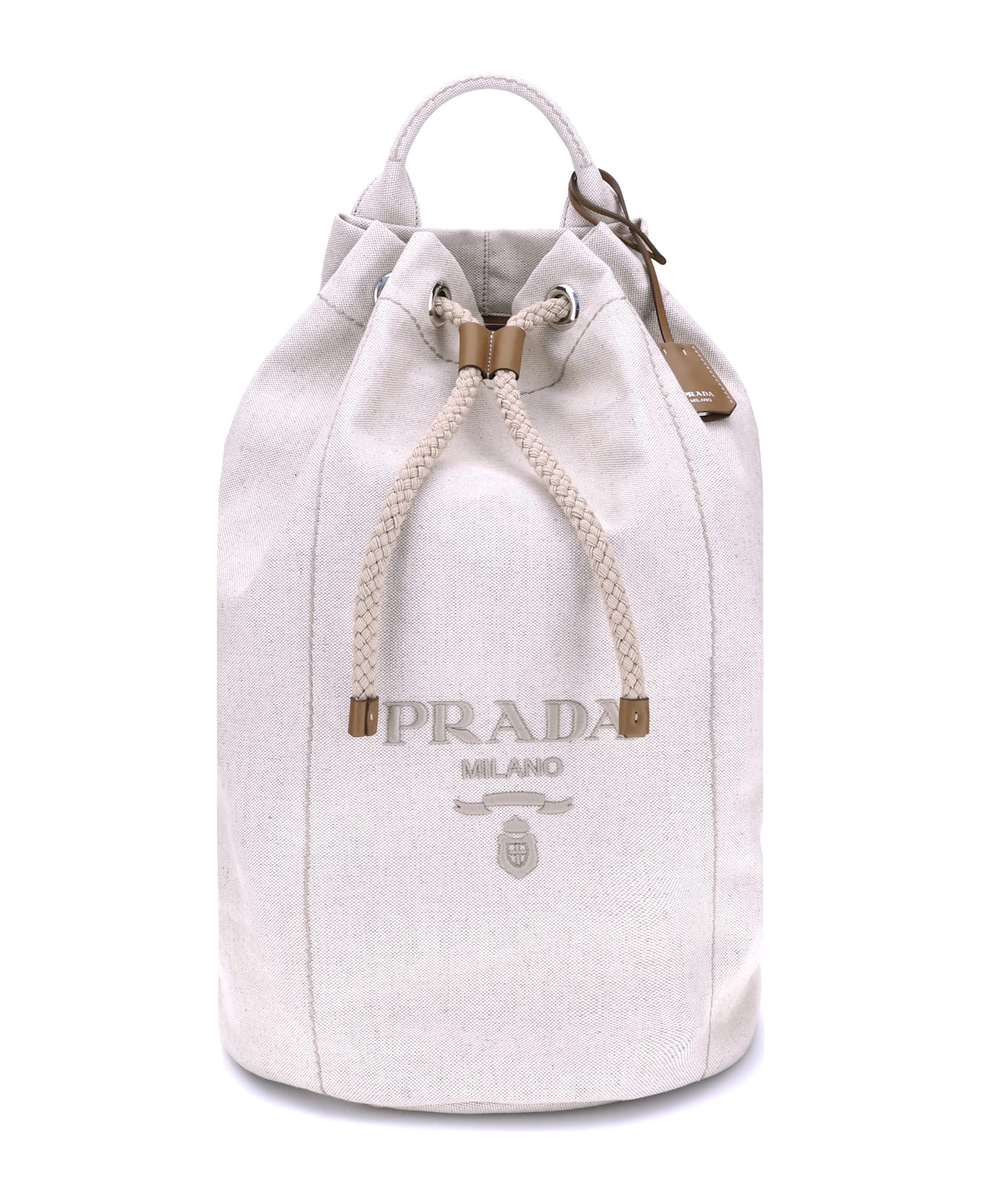 Prada's linen bucket bag features a lightweight design with a sporty character. it features a linen handle and an adjustable shoulder strap enhanced with leather details and the iconic tone-on-tone embroidered logo that gives the accessory a distinctive and timeless style. the closure is drawstring, easy and secure. Composition: 50% % Cotton, 50% % Linen