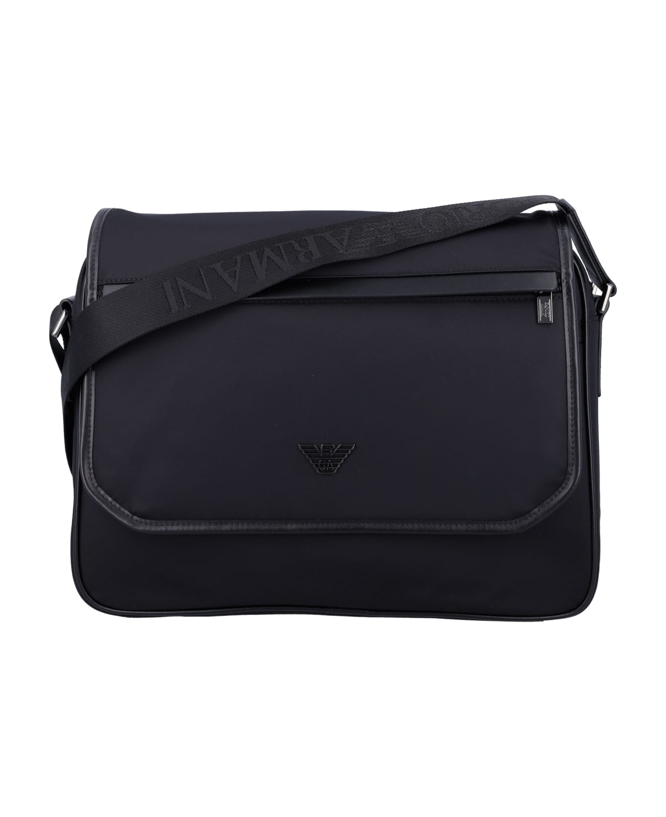 Nylon Messenger Bag By Emporio Armani. Featuring: Nylon Bag Flap Closure With Magnetic Snap Embossed Emporio Armani Logo On The Front Adjustable Shoulder Strap With Logo Detail Front Zip Pocket Height: 28cm Width: 35cm Depth: 10cm