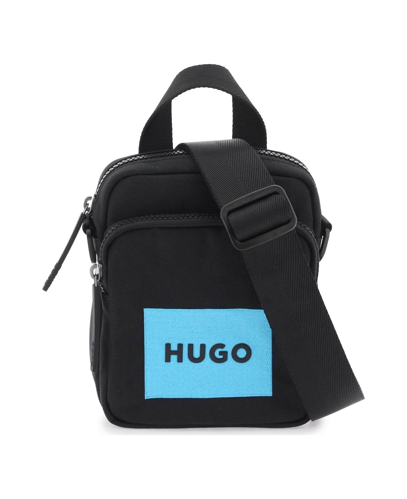 The HUGO crossbody bag is made of recycled nylon and features an embroidered logo patch in contrasting colors. It has two zip compartments, a top handle, and an adjustable and removable shoulder strap.